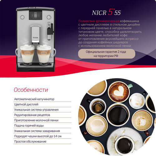 Кофемашина Nivona NICR 555 CafeRomatica, 15 Бар, Эспрессо, Латте, Капучино, Автоочистка информация:
