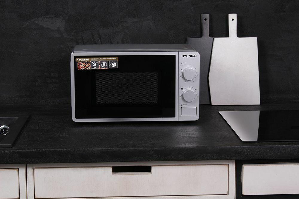 Микроволновая печь Hyundai HYM-M2001 серебристый, с механическим управлением, объем камеры 20 л, мощность 700 Вт, открывание дверцы кнопкой, функции разогрева и разморозки информация: