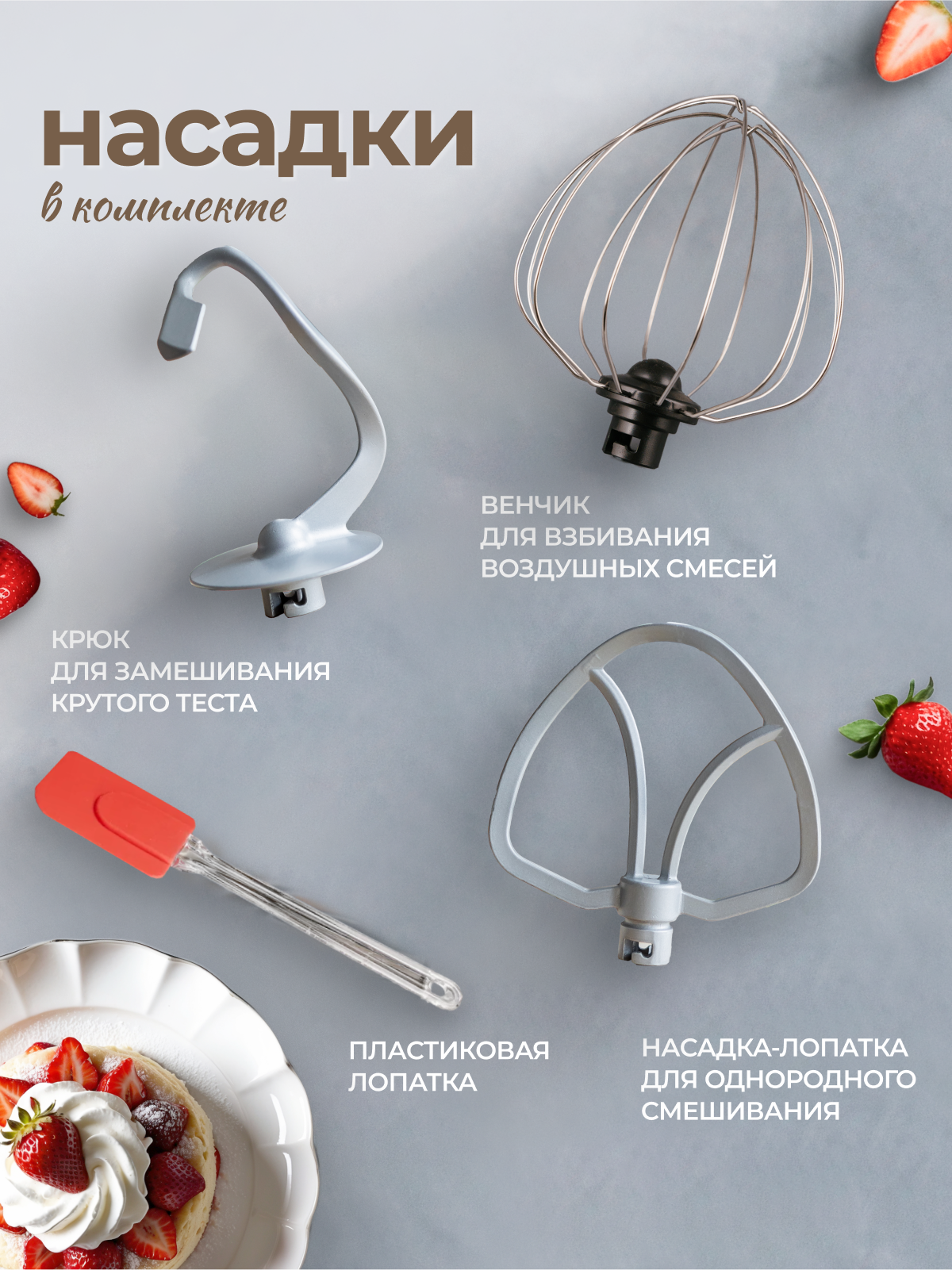| Насадки | венчик для взбивания / крючки для замешивания теста / лопатка / насадка-блендер |