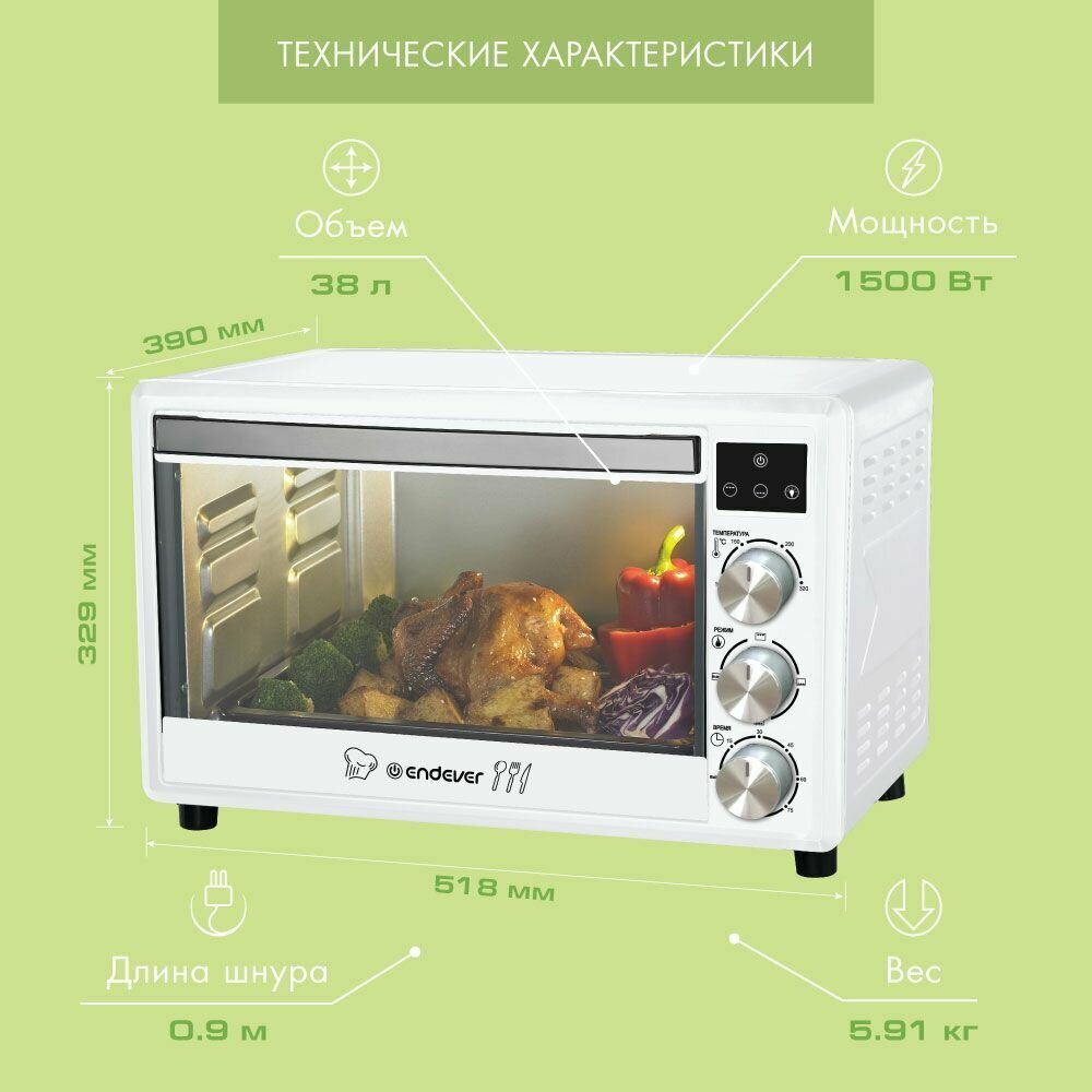 Мини печь электрическая Endever Danko 6039, 1500 Вт, духовка электрическая настольная 38 литров, 100-320 градусов информация:
