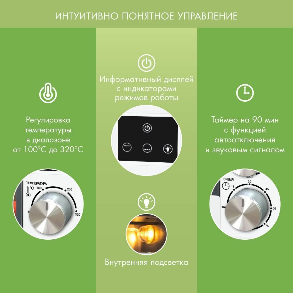 | Дополнительная информация | размер противня 37.5*27.3*2.6 см; размер решетки 37.5*27*0.5 см; нагревательные элементы из нержавеющей стали, большая дверца и удобная ненагревающаяся ручка, таймер с функцией автоотключения и звуковым сигналом, количество противней в комплекте: 1, длина шнура 0,9 метра. |