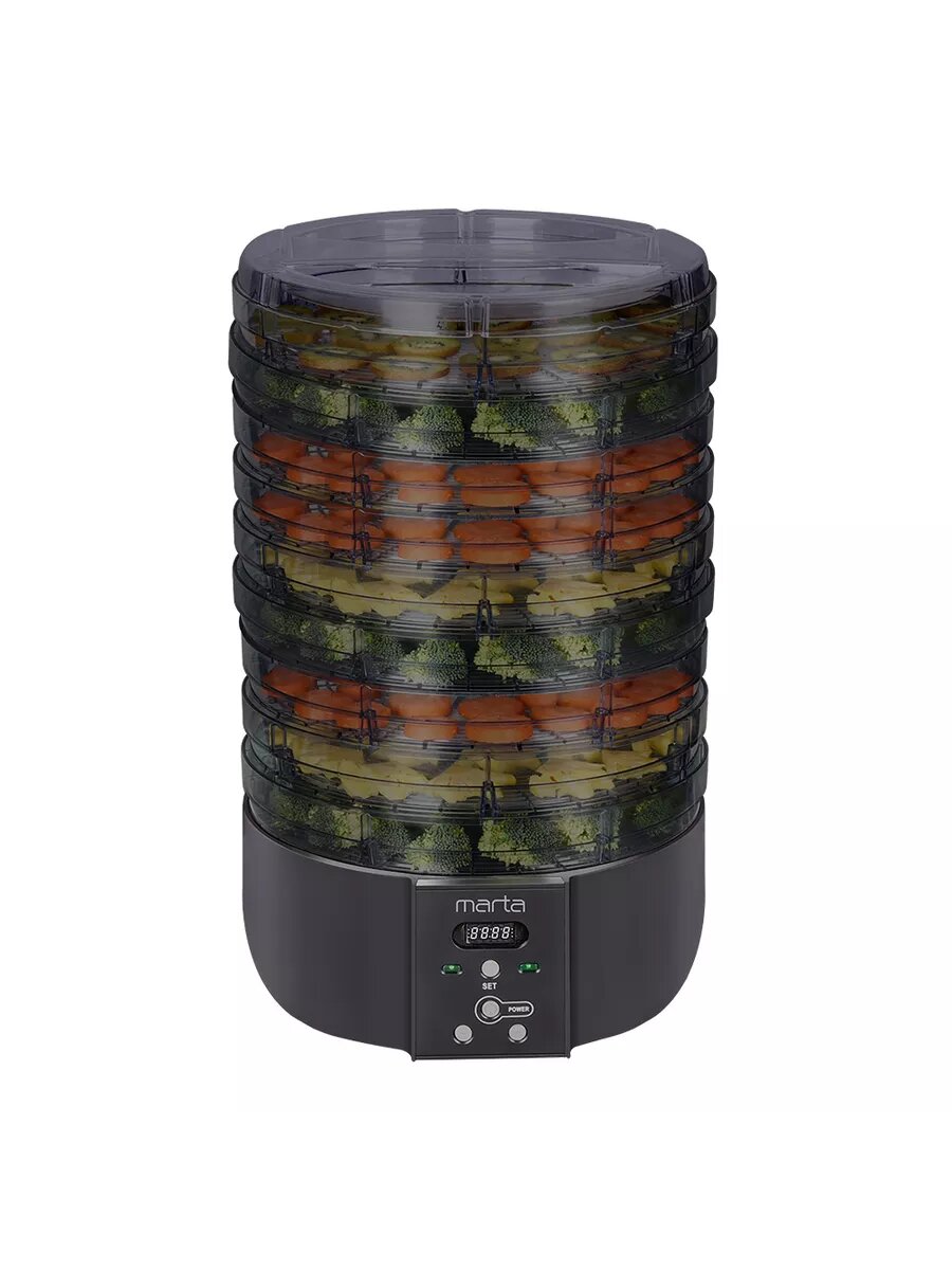 10 цен на Дегидратор сушилка для овощей электросушилка MARTA MT-FD1886C 15 поддонов (9 основных + 3 для пастилы + 3 для ягод) черный жемчуг