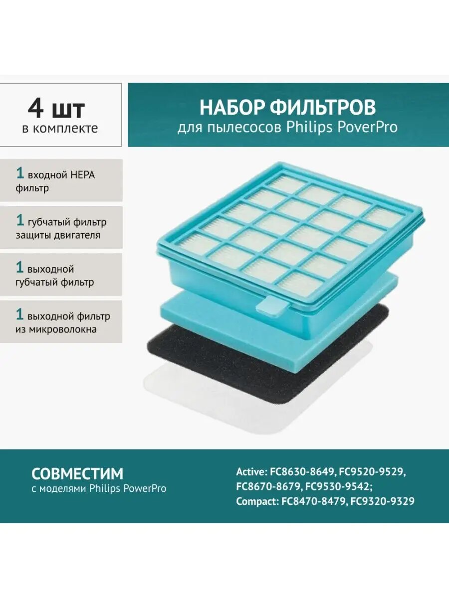 Набор фильтров для пылесосов Philips FC8630-8649, FC9520-9529, FC8670-8679, FC9530-9542, FC8470-8479, FC9320-9329 информация:
