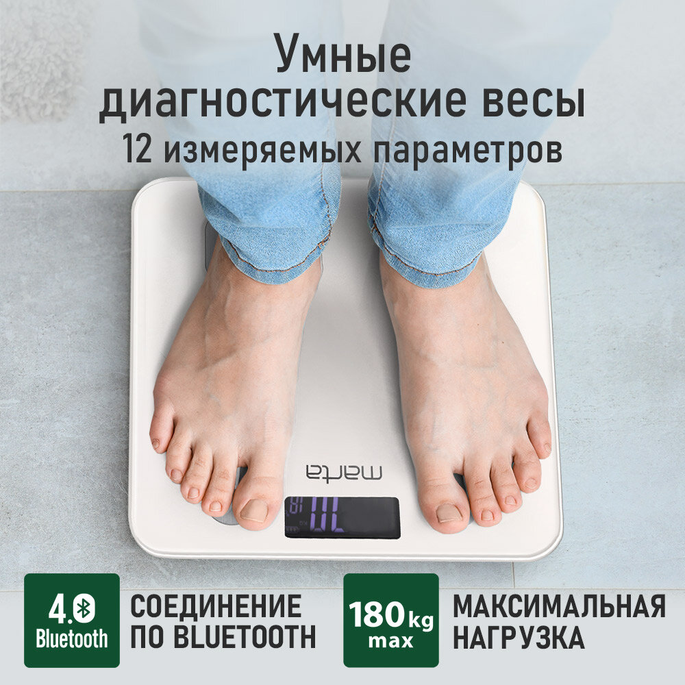 Весы напольные MARTA MT-1683 белый жемчуг LCD диагностические, умные с Bluetooth