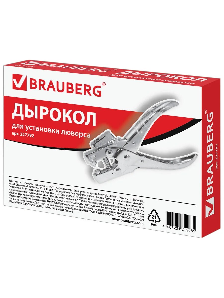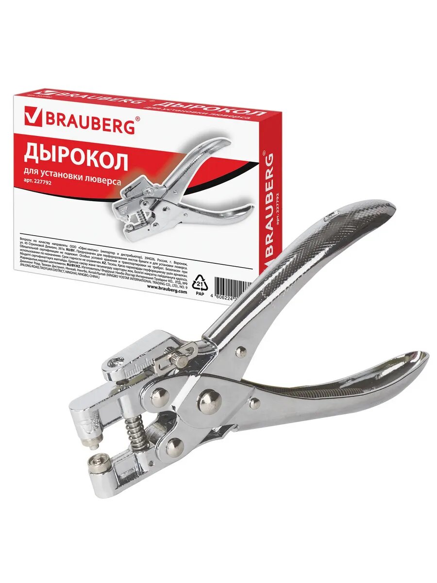 Дырокол BRAUBERG на 1 отверстие, для установки люверса, до 30 л, диаметр отверстия 5 мм, хром