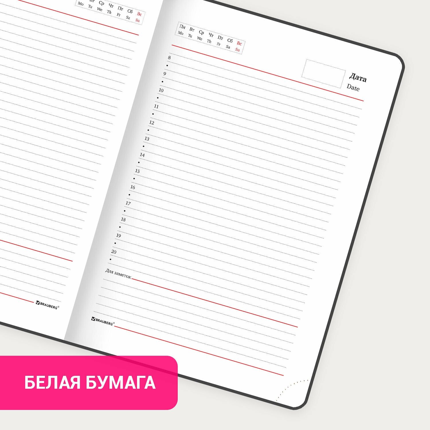 | Особенности | перфорация уголков / справочная информация / ляссе / держатель для ручки / прошивка по периметру обложки |