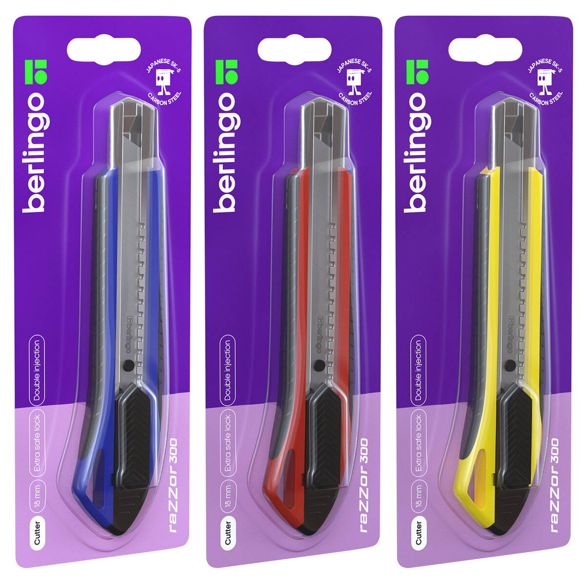 Нож канцелярский 18мм Berlingo "Razzor 300", auto-lock, металл. направл., мягкие вставки, ассорти, европодвес И 4260753550597