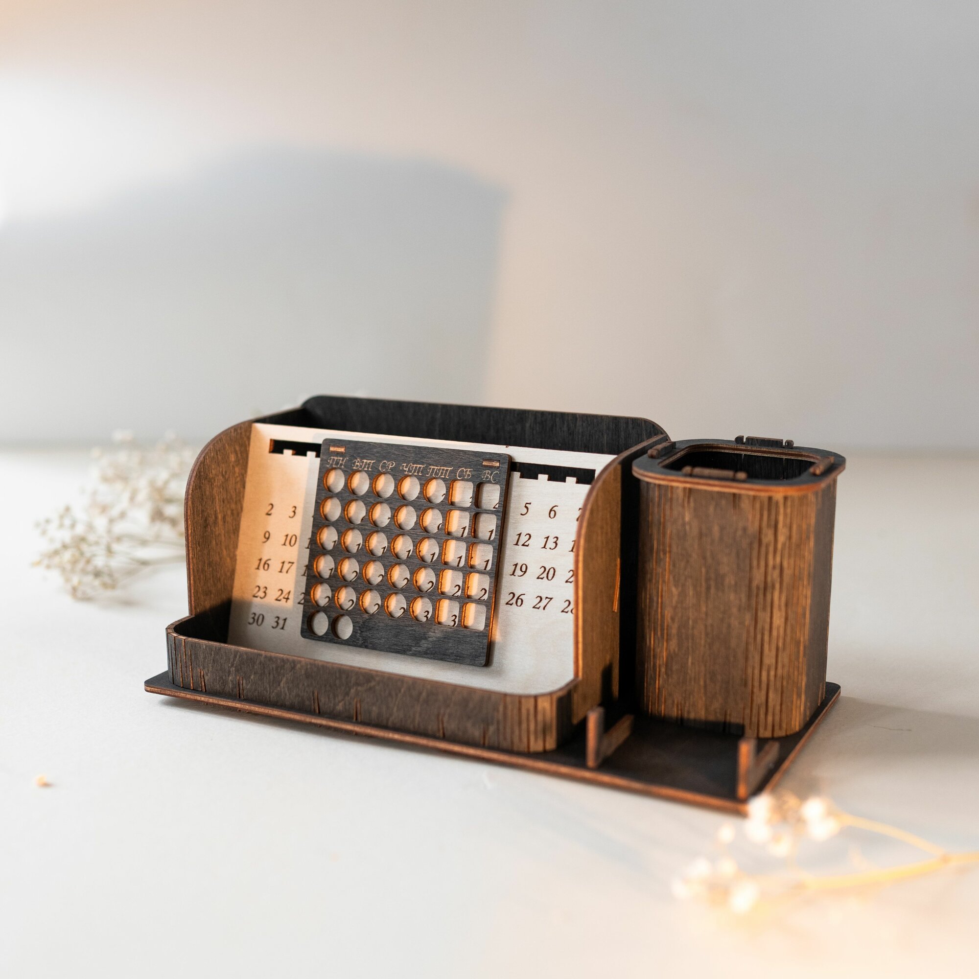 Деревянный настольный органайзер Bezusoff для канцелярии, коричневый с вечным календарем и подставкой под телефон 25 см на 12 см