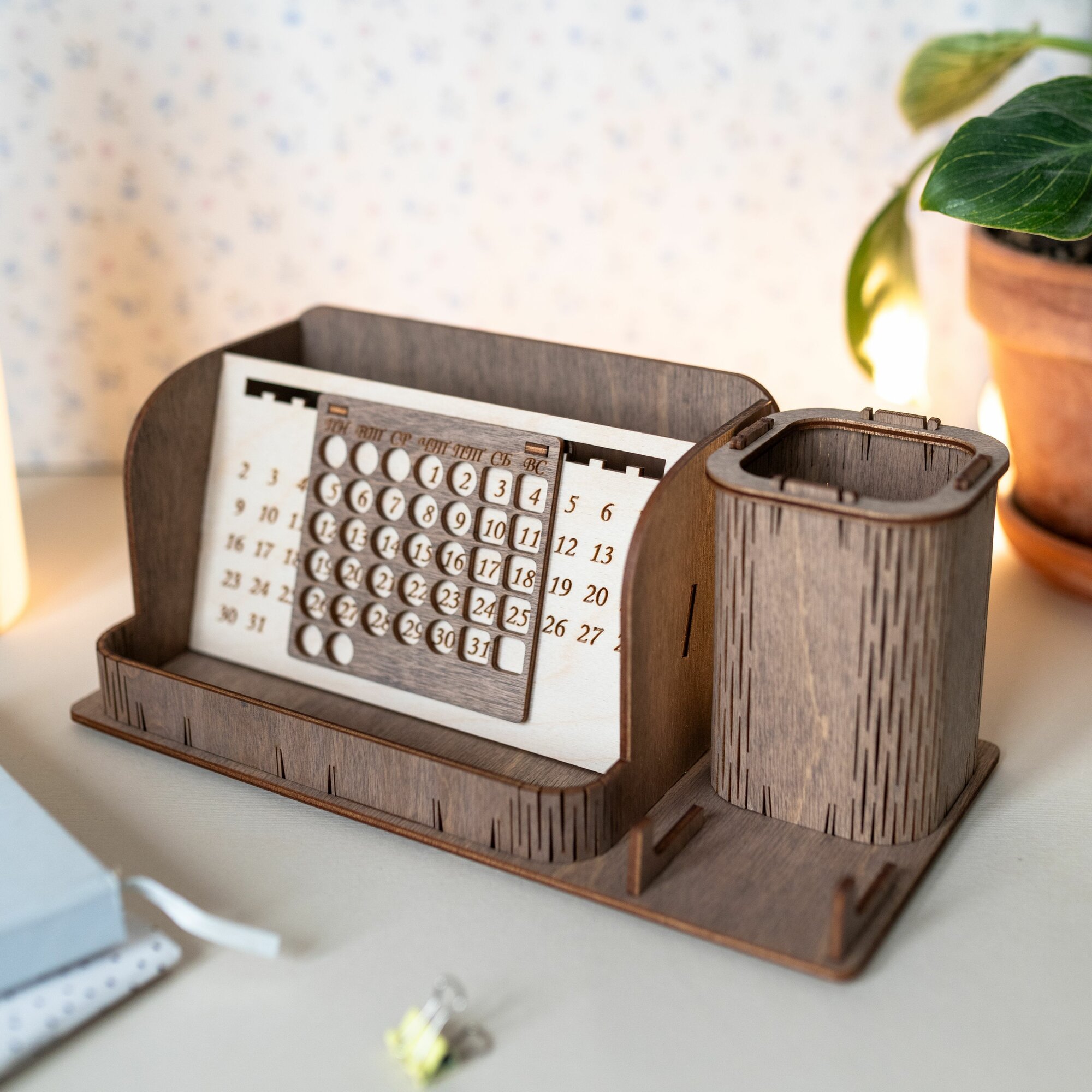 10 цен на Деревянный настольный органайзер Bezusoff для канцелярии, коричневый с вечным календарем 25 см на 12 см