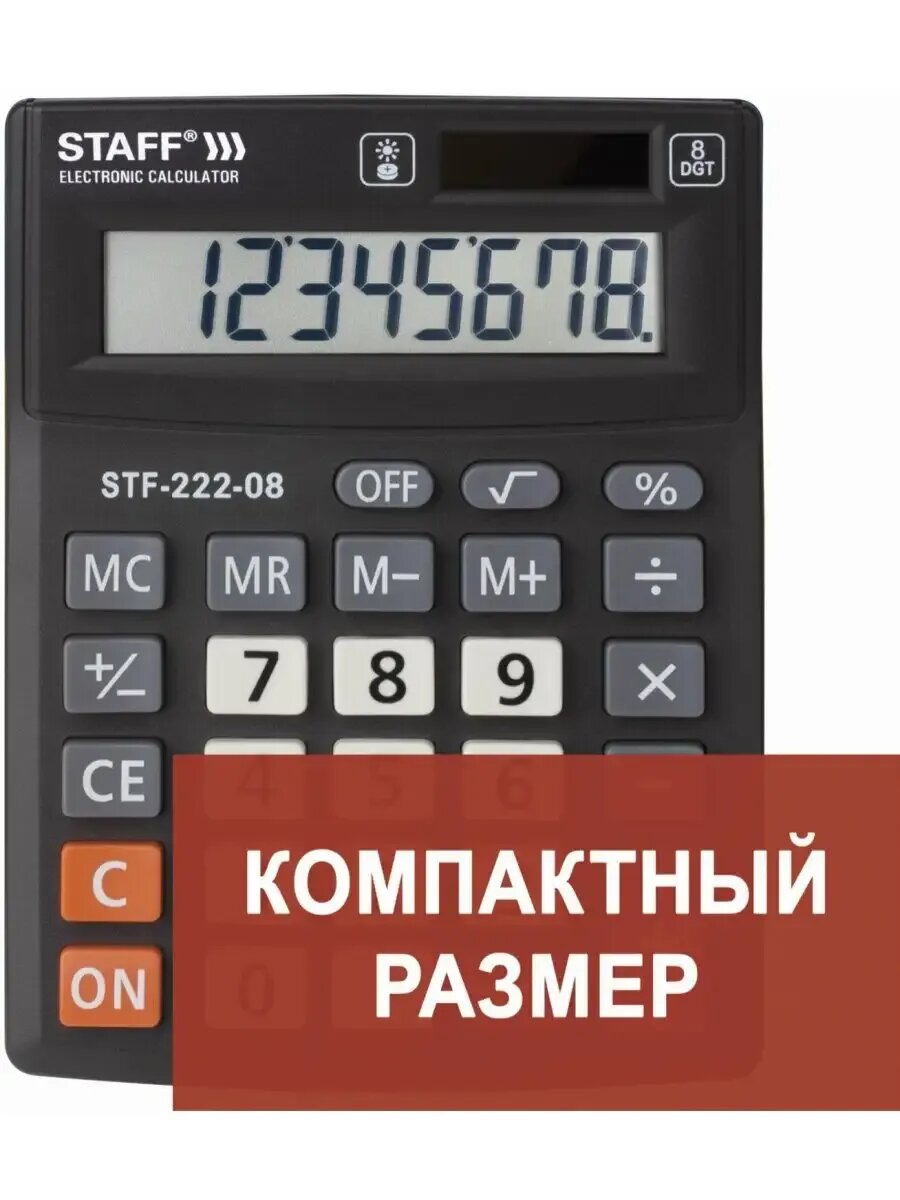 Настольный калькулятор STAFF PLUS STF-222, компактный 138x103мм, 8 разрядов, двойное питание, 250418