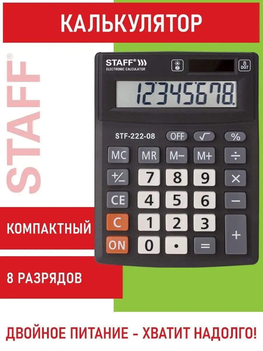 Калькулятор настольный STAFF PLUS STF-222, компактный (138x103 мм), 8 разрядов, двойное питание, 250418, 250418 730 ₽