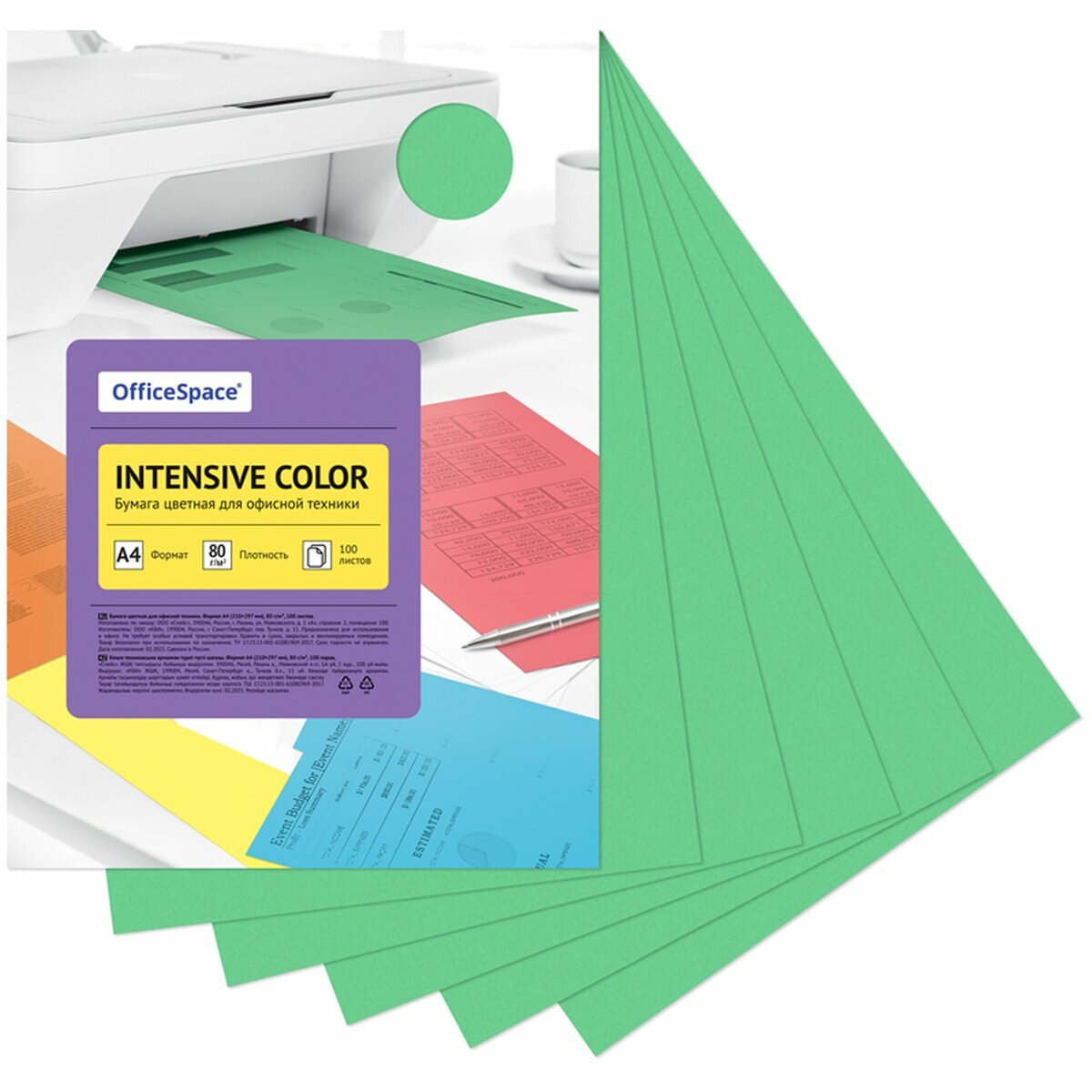 Бумага цветная А4 OfficeSpace Intensive Color интенсив зеленая, 80 г/кв. м, 100 листов (IC_38228), 20 уп. информация: