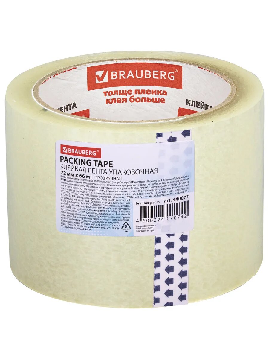 Клейкая лента Brauberg упаковочная 72 мм х 66 м, прозрачная, гарантированная длина, 45 мкм (440077)