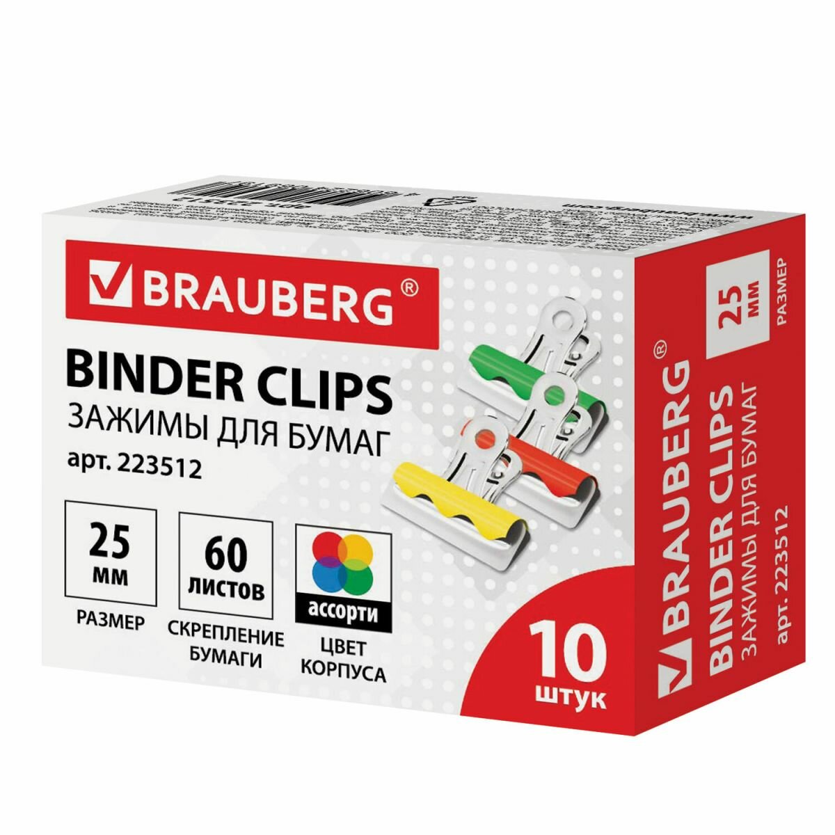Зажимы-бульдоги для бумаг BRAUBERG, комплект 10 шт., 25 мм, на 60 листов, картонная коробка, 223512 Комплект : 1 шт .