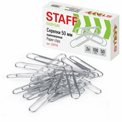 Скрепки большие 50 мм, STAFF "EVERYDAY", оцинкованные, 100 шт, в картонной коробке, россия, 226755 информация: