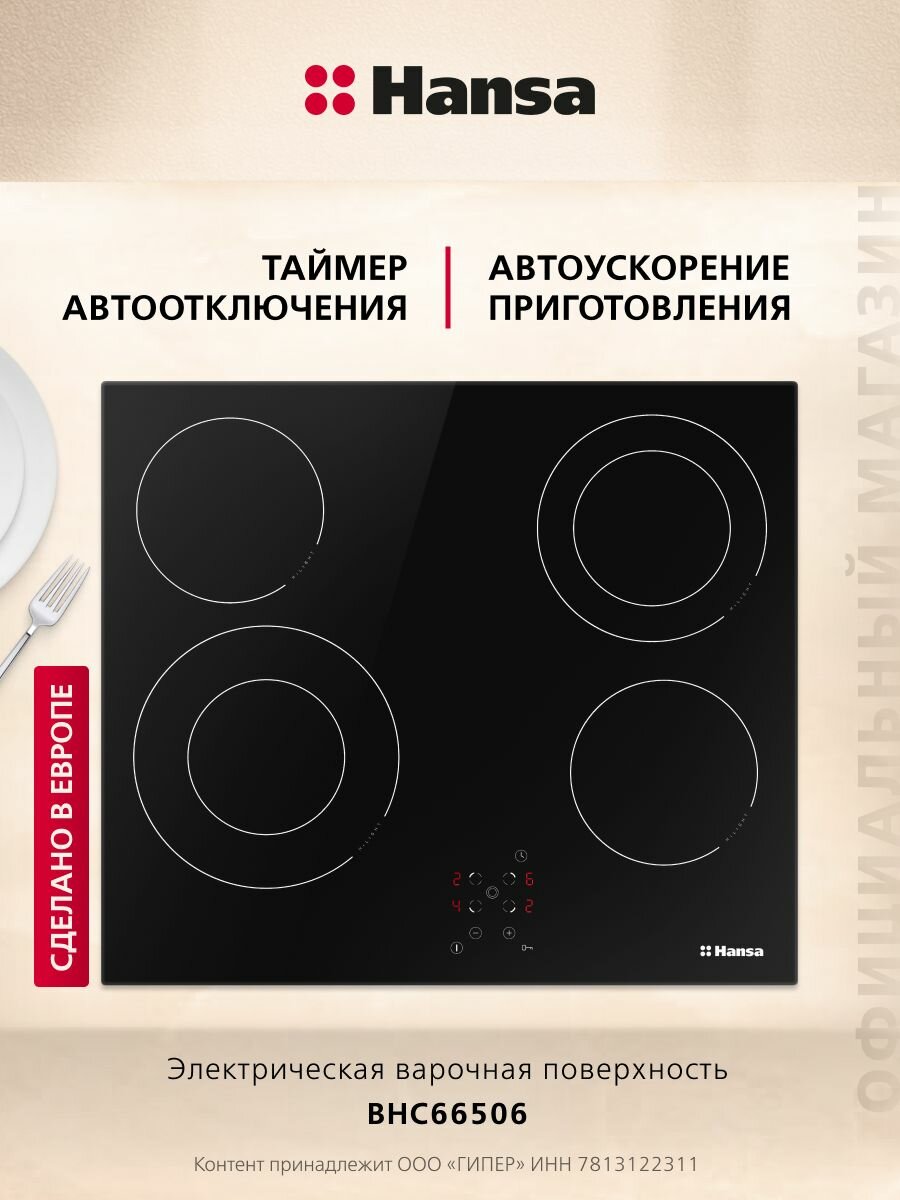 10 цен на Электрическая варочная панель Hansa BHC66506, встраиваемая, 60 см, автоматика закипания, таймер автоматического отключения, стеклокерамика с сенсорным управлением