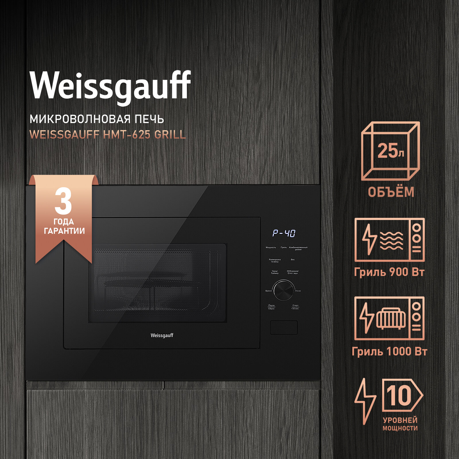10 цен на Микроволновая печь WEISSGAUFF HMT-625 Grill, встраиваемая, 20л, 900Вт, черный [430491]