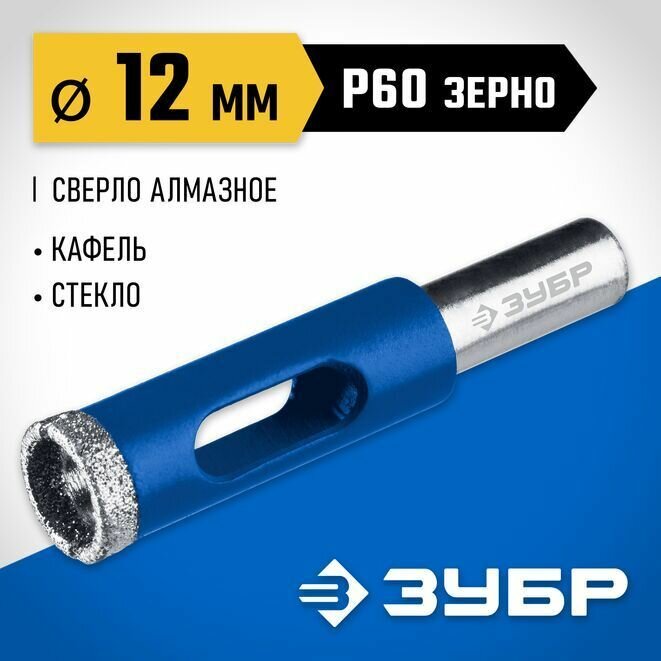 10 цен на Сверло трубчатое по кафелю и стеклу ЗУБР 12 мм, Р 60, алмазное, Профессионал