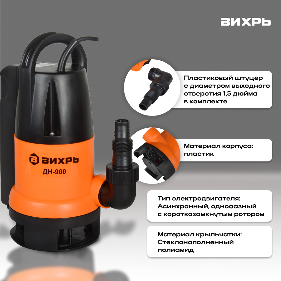 Дренажный насос вихрь ДН-900, 900 Вт, макс. напор – 8 м, 258 л/мин, для грязной воды информация:
