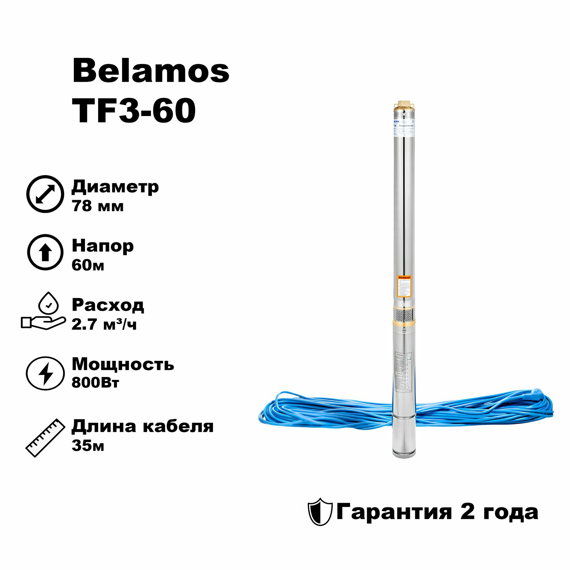 Насос погружной скважинный Belamos TF3-60 2,7 м3/час, 45 л/мин, Н-60 м, d-78 мм, каб. 35м. Насос для скважин 10-35м центробежный беламос