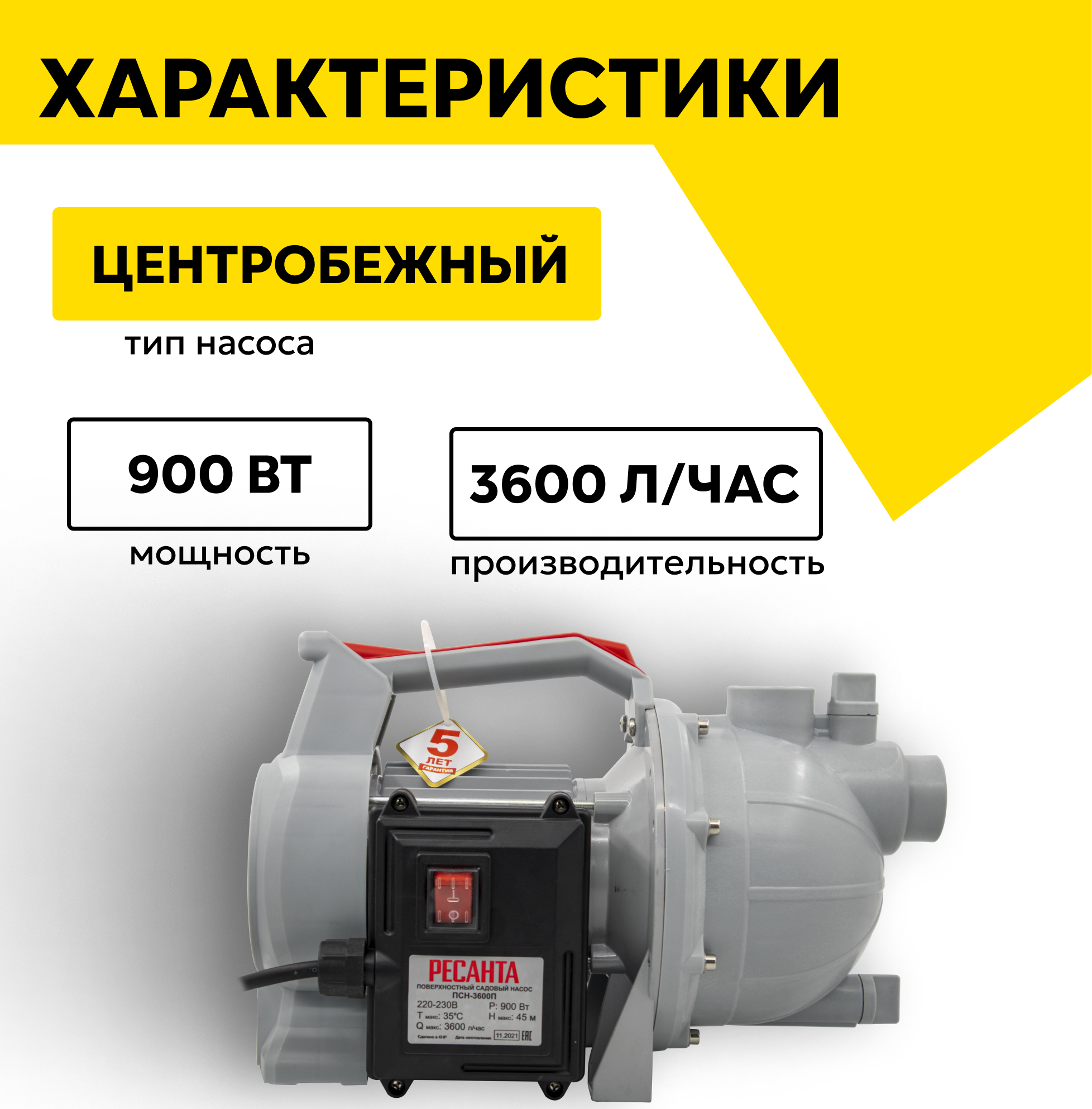 Поверхностный насос Ресанта ПСН-3600П, 900 Вт, высота подъема – 45 м, 60 л/мин, G1 информация: