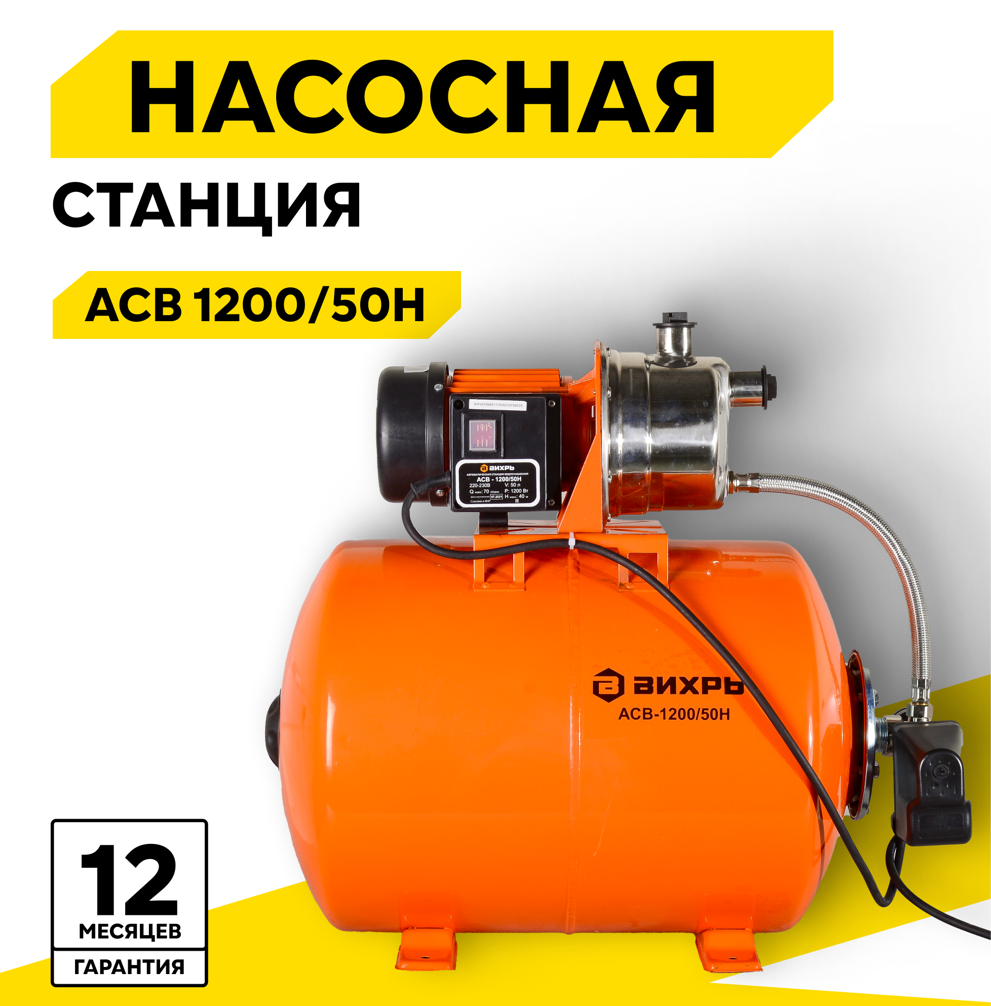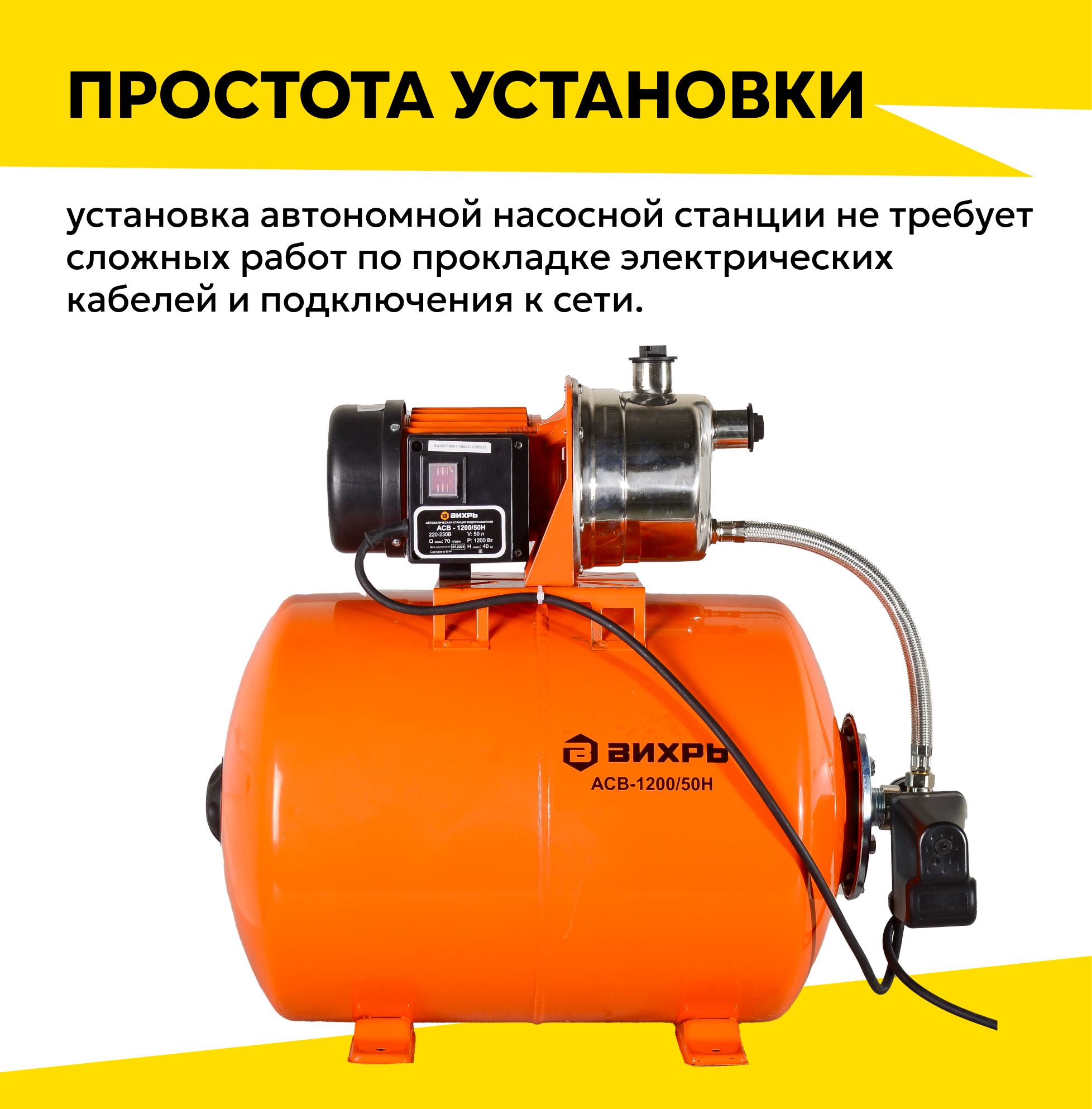 Автономная станция водоснабжения Вихрь АСВ-1200/50Н, 1200 Вт, напор – 40 м, 70 л/мин, гидроаккумулятор – 50 л информация: