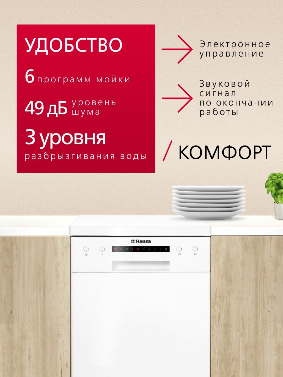 10 цен на Узкая посудомоечная машина Hansa ZWM416WEH, 45 см, 6 программ, 9 комплектов посуды, 3 корзины, половинная загрузка, система Aquastop, белая