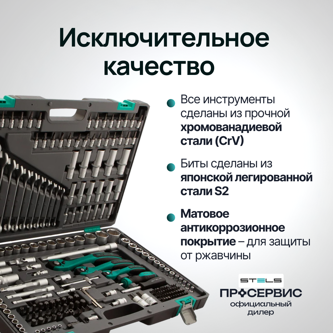 Набор инструментов, 1/4", 3/8", 1/2", Cr-V, S2, усиленный кейс, 216 предметов Stels информация: