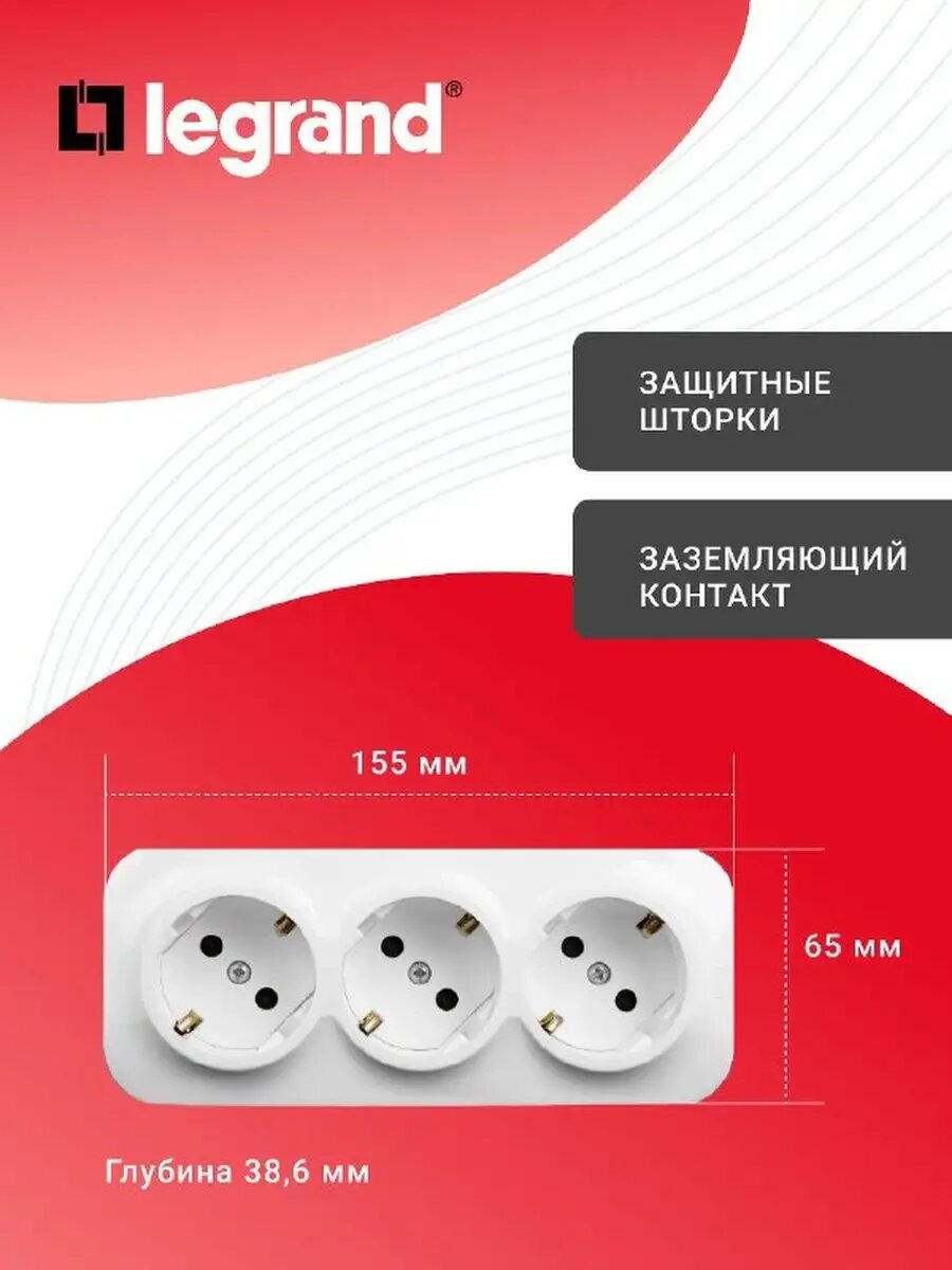 Розетка 3-м ОП Quteo 16А IP20 250В 3х2P+E с заземлением, с защитными шторками, белый, оригинал Legrand 782238