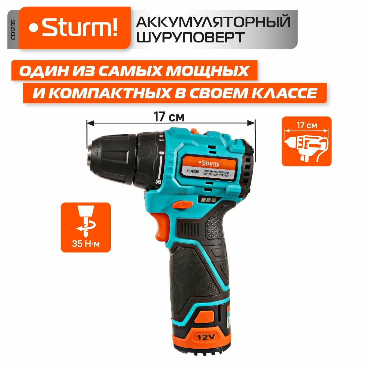 CD1235 Дрель аккумуляторная б/щ Sturm, 12В, 1BatterySystem12V, 35Нм, 1x2.0Ач, TYPE-C, картон информация: