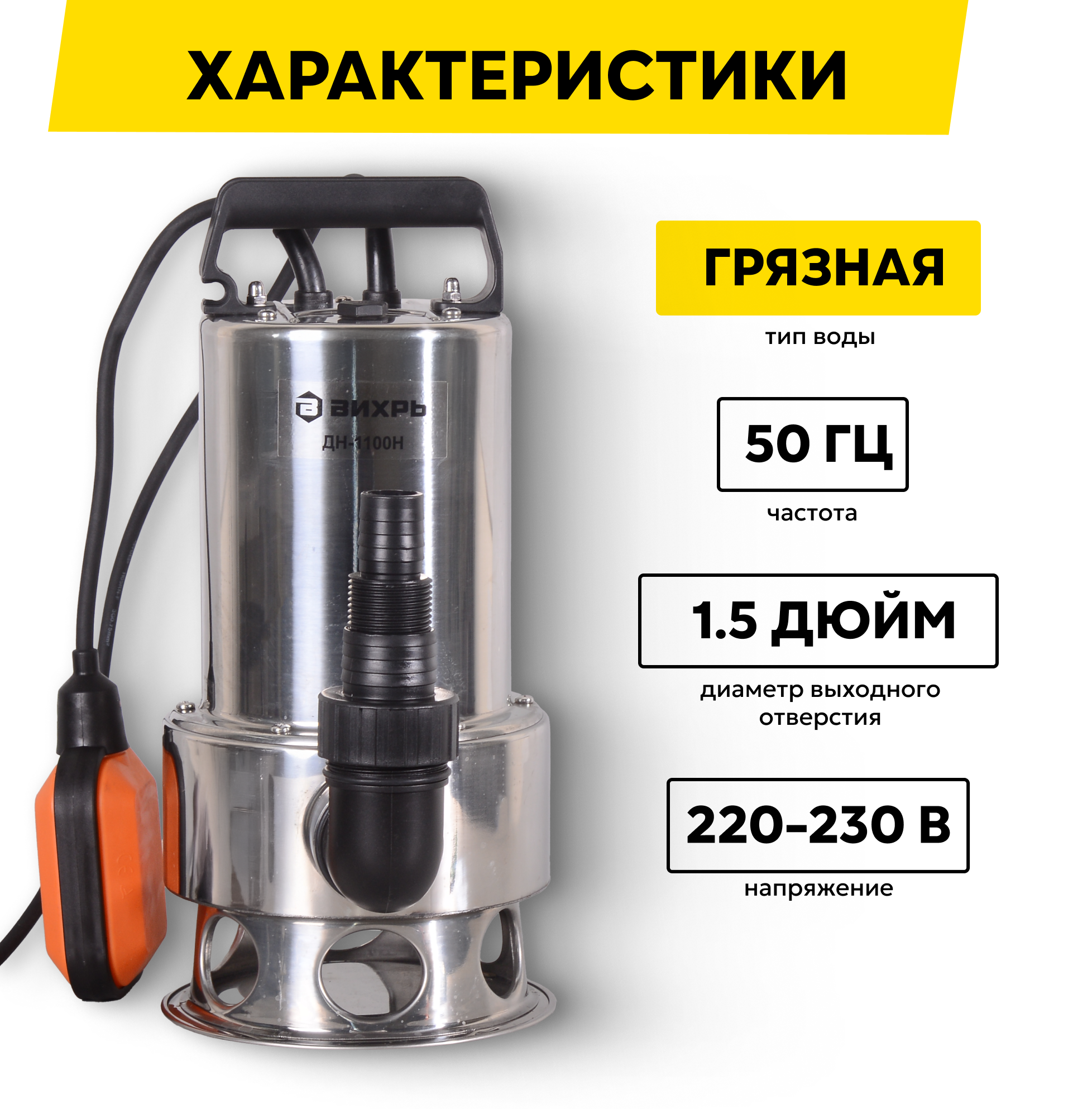 Дренажный насос Вихрь ДН-1100Н, 1100 Вт, макс. напор – 10 м, 258 л/мин, для грязной воды информация: