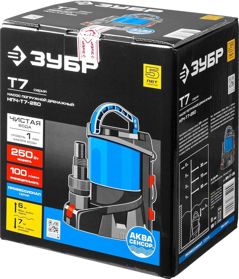 ЗУБР Насос Т7 АкваСенсор погружной, ЗУБР Профессионал НПЧ-Т7-250, дренажный для чистой воды, 250 Вт, мин. уровень 1 мм, 100 л/мин, напор 6 м, провод 10 м, ( НПЧ-Т7-250 ) информация: