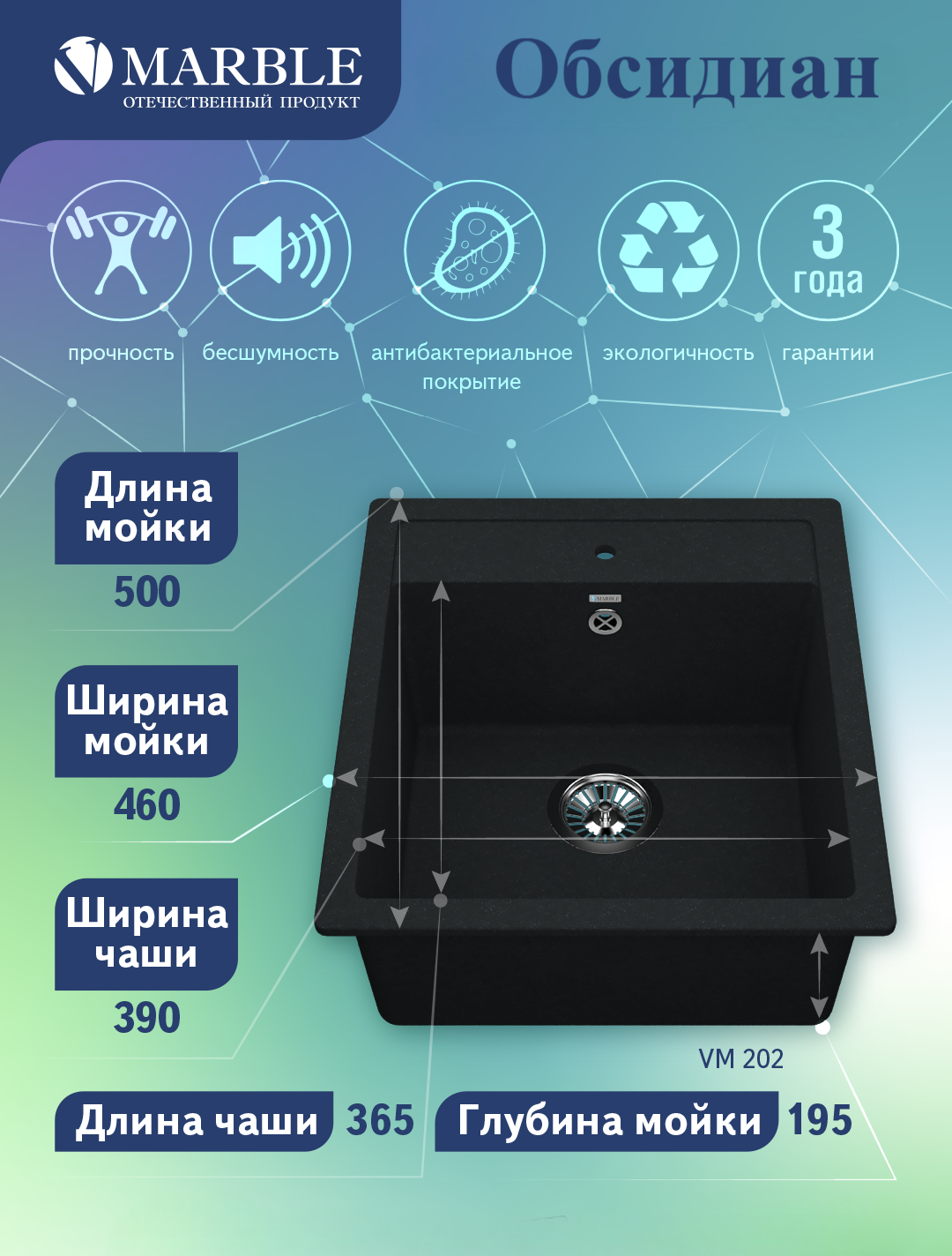 Кухонная мойка MARBLE VM202 обсидиан искусственный мрамор, квадрат информация: