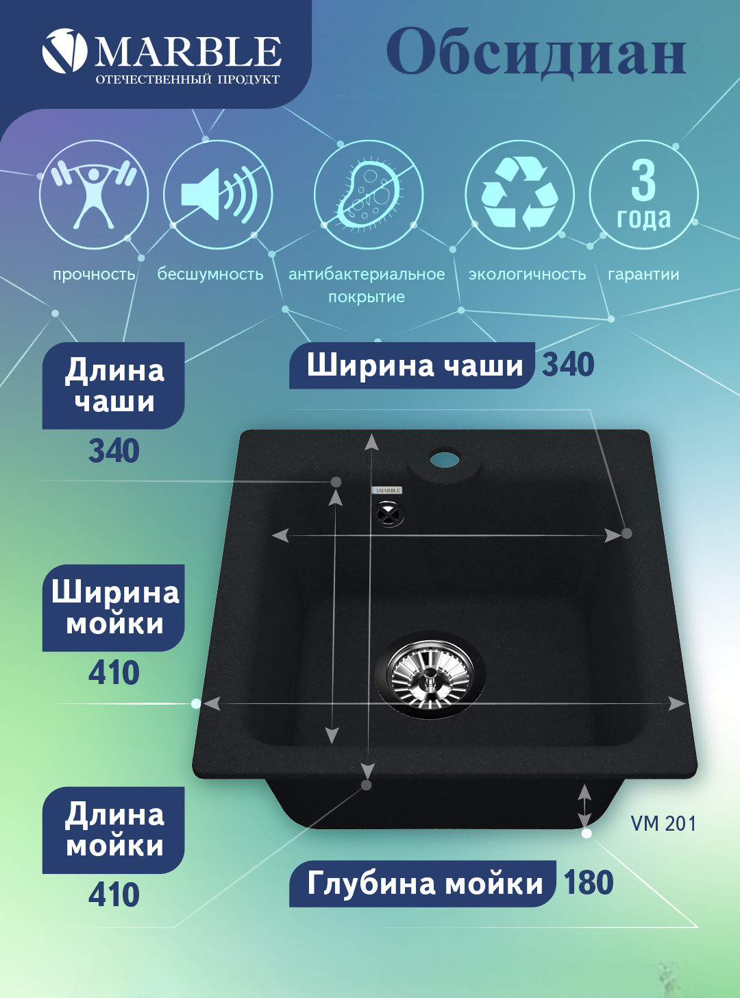 Кухонная мойка MARBLE VM201 обсидиан искусственный мрамор, квадрат информация: