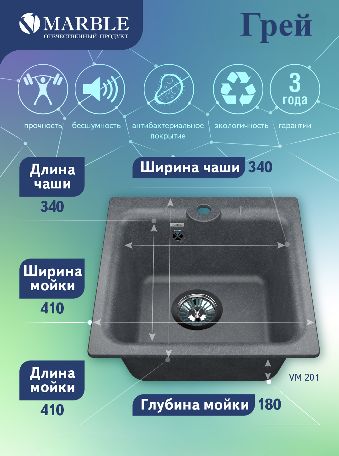 Кухонная мойка MARBLE VM201 грей искусственный мрамор, квадрат информация: