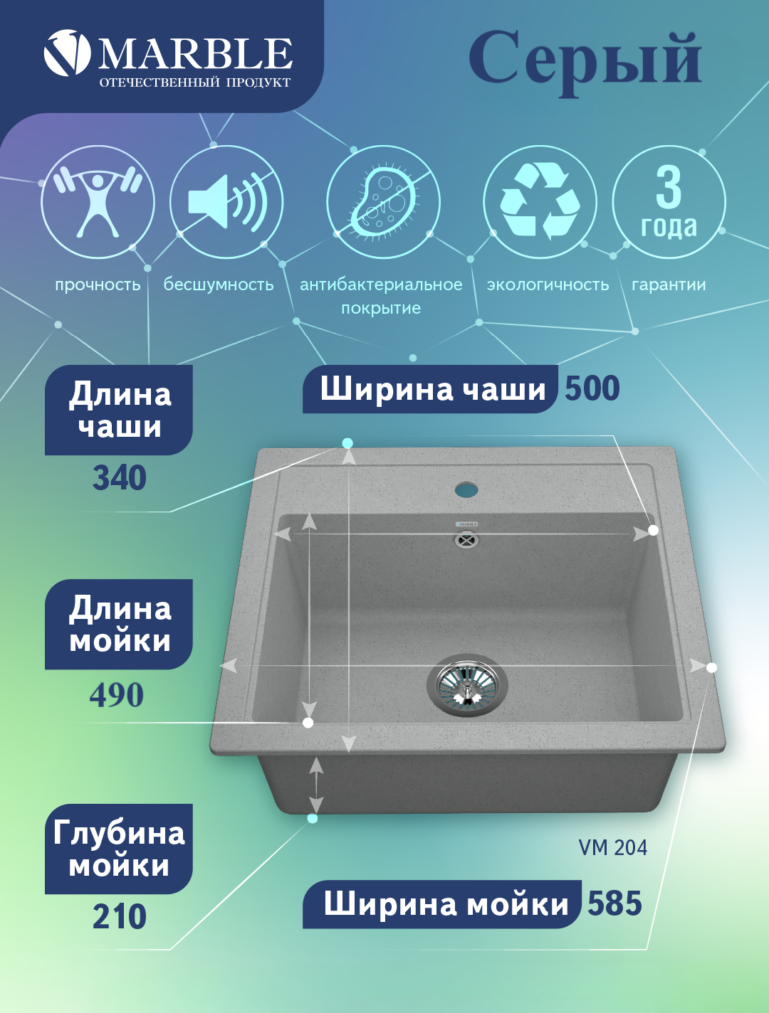 Кухонная мойка MARBLE VM204 серый искусственный мрамор, прямоугольная информация: