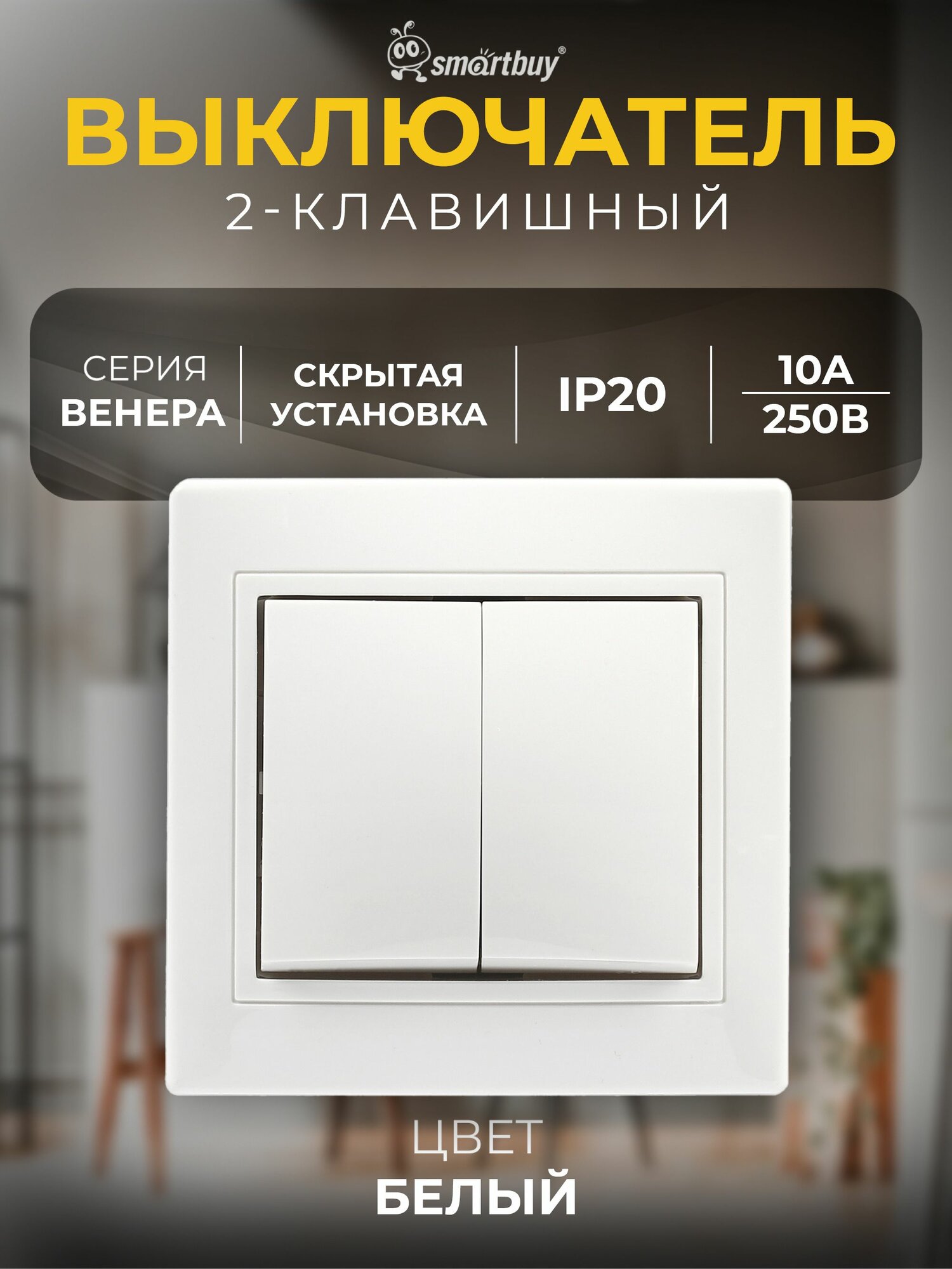 Выключатель Smartbuy 2-клавишный 10А, керамика "Венера" (SBE-01w-10-SW2-0-c), белый информация: