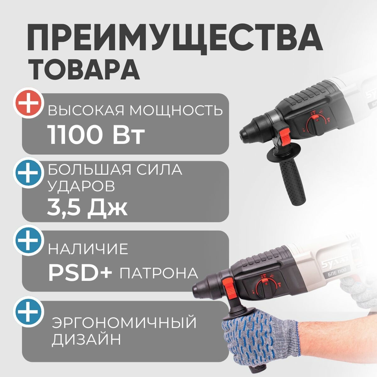 БПЕ 1100 Перфоратор гориз.1100Вт, 3реж, 3,5Дж, SDS+ 0-4000уд/мин, 0-900об/мин булат информация: