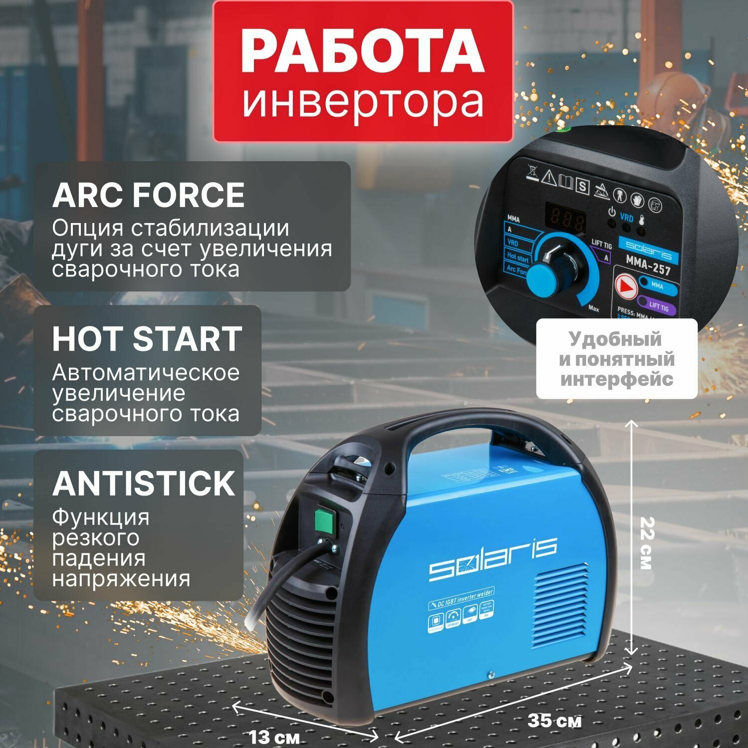 10 цен на Инвертор сварочный SOLARIS MMA-257 (230В; 20-200 А; 82В; электроды диам. 1.6-5.0 мм; вес 5.2 кг) (MMA-257)