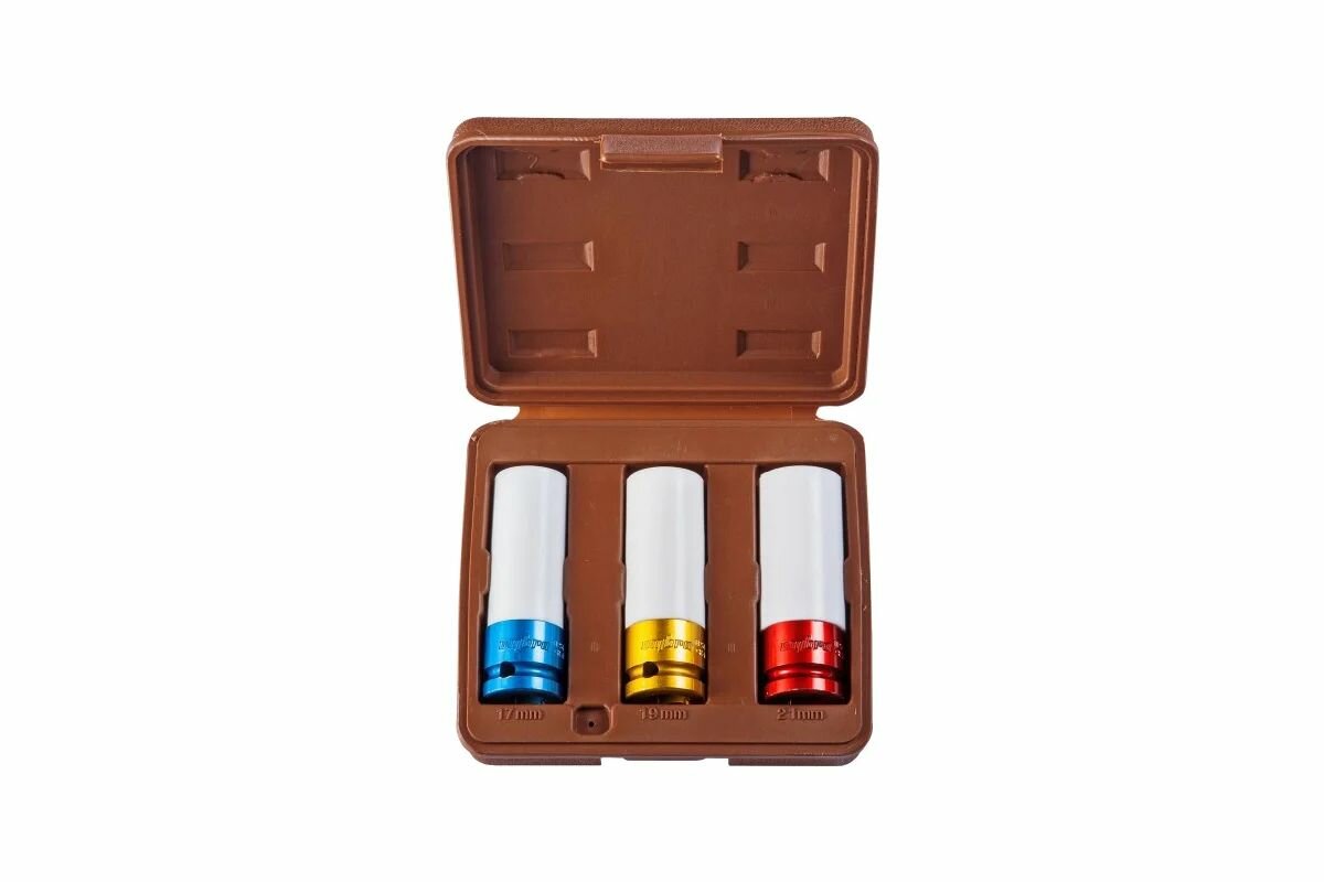 | Подробная комплектация | Набор головок торцевых глубоких для ударного инструмента 1/2"DR, для лекгосплавных колесных дисков, 17,19,21 мм, 3 предмета Ombra |