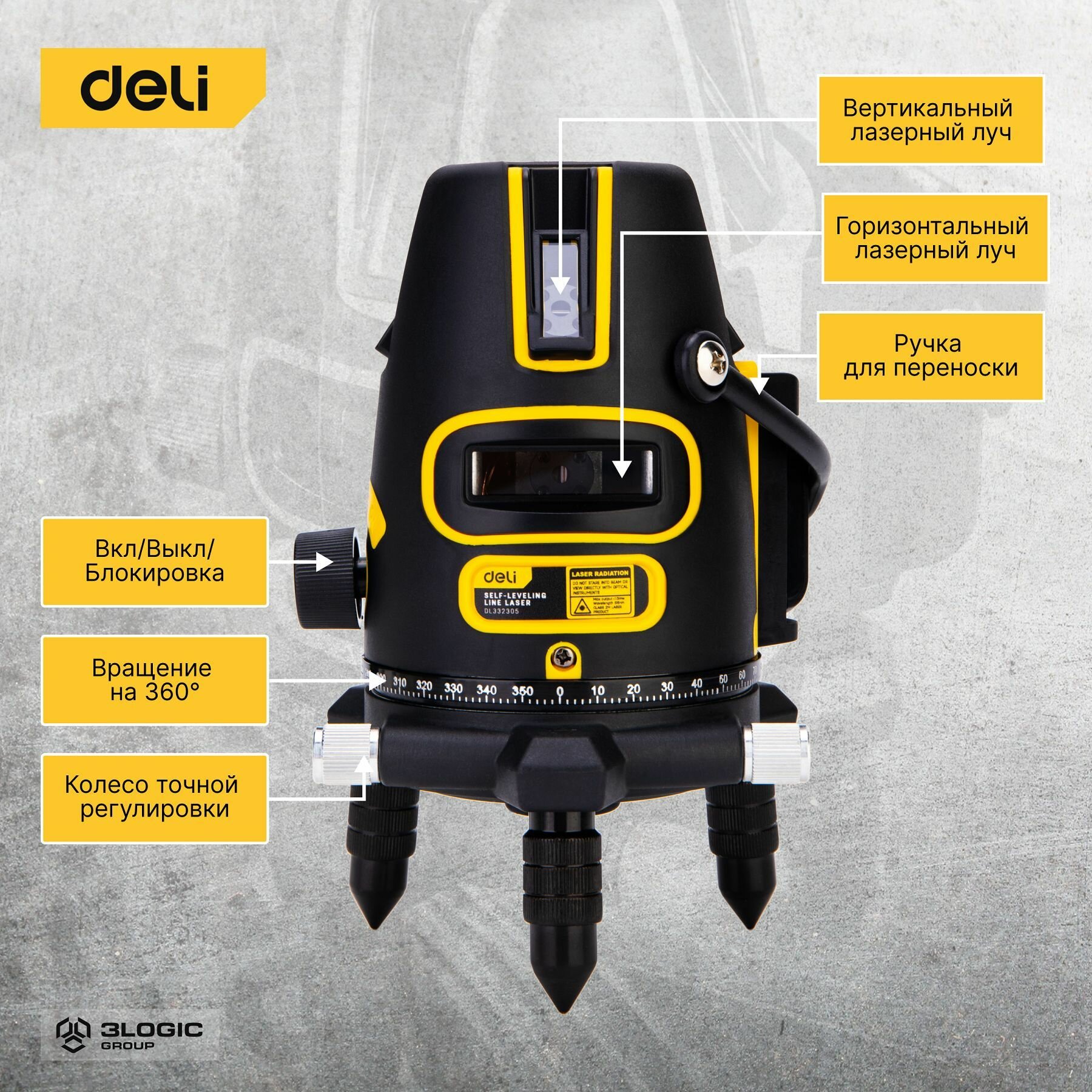 Лазерный уровень (нивелир) Deli DL332305 5 лучей (Время работы 4ч, угол +/-3 град, самовыравнивание, зелёный луч) информация: