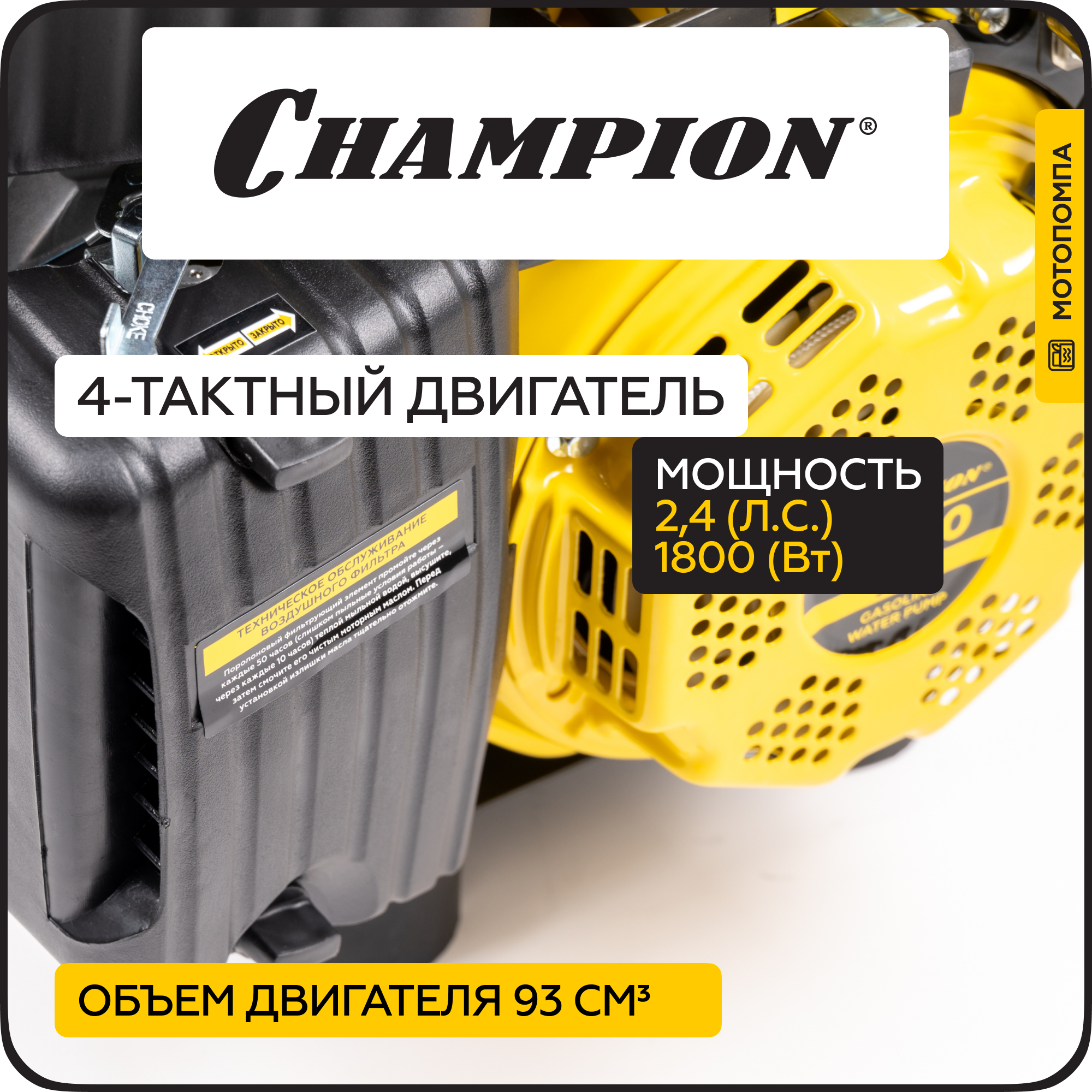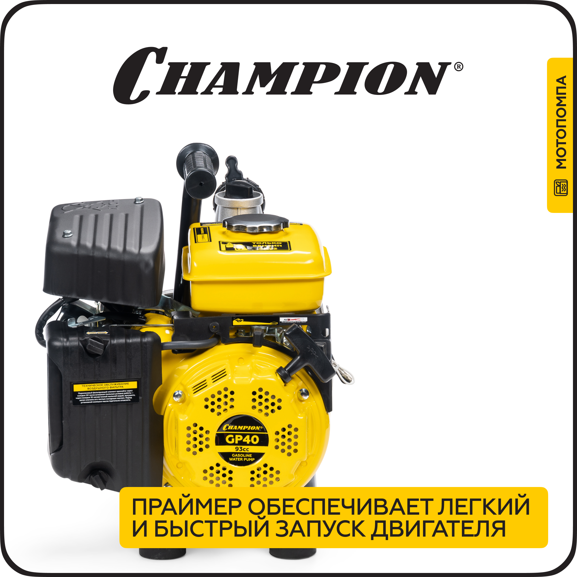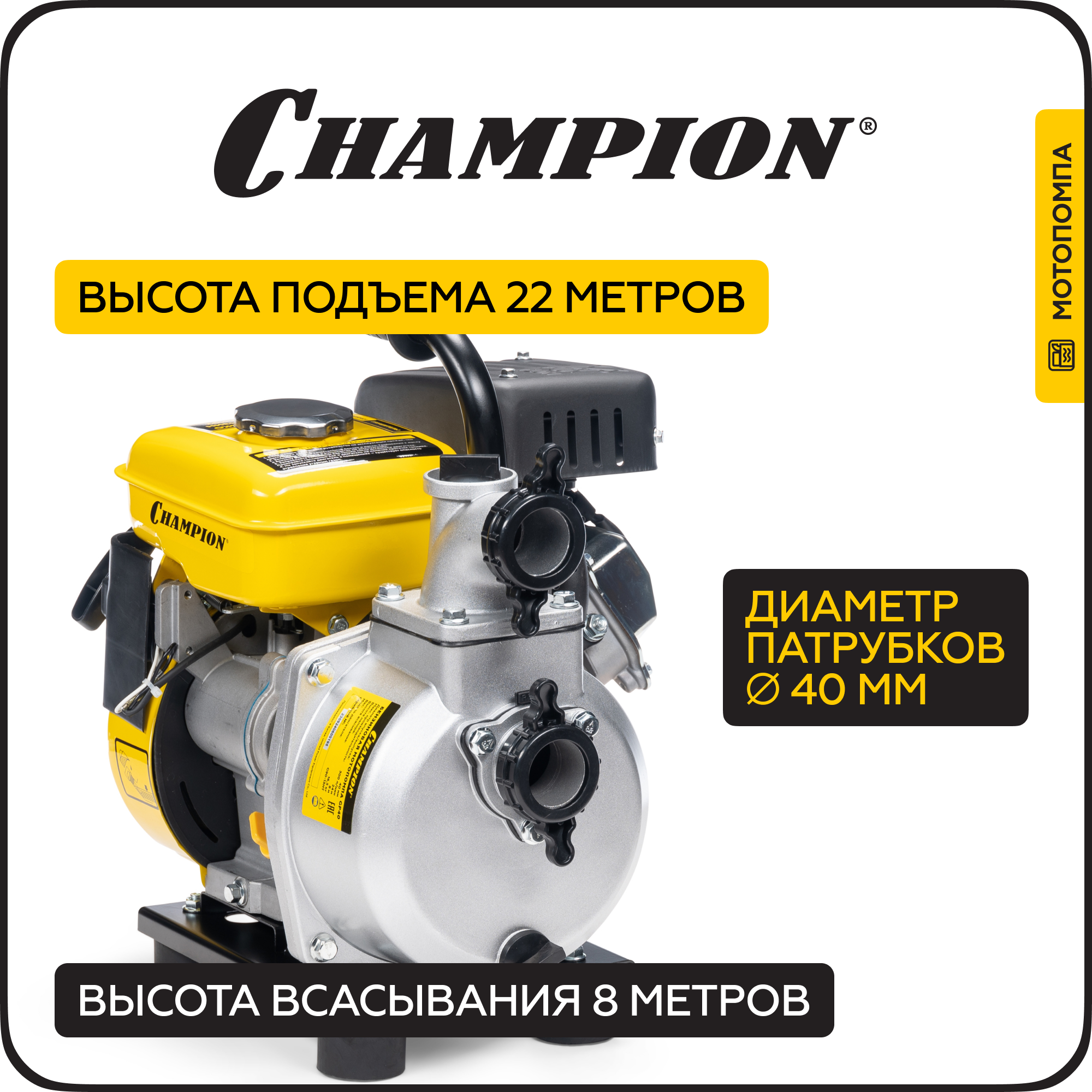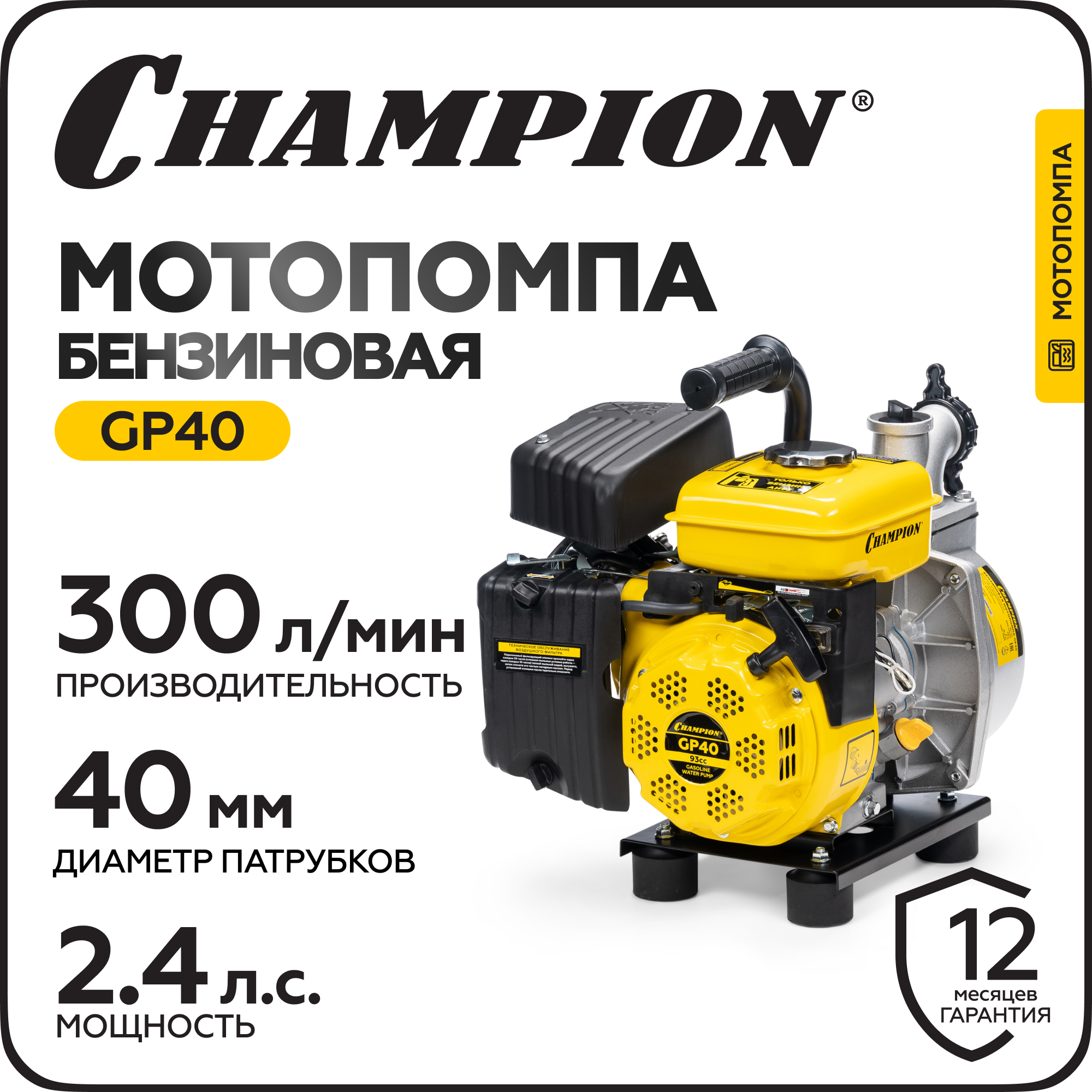 Мотопомпа бензиновая CHAMPION GP40, 1,9 кВт, 300 л/мин, для чистой воды, ручной запуск информация: