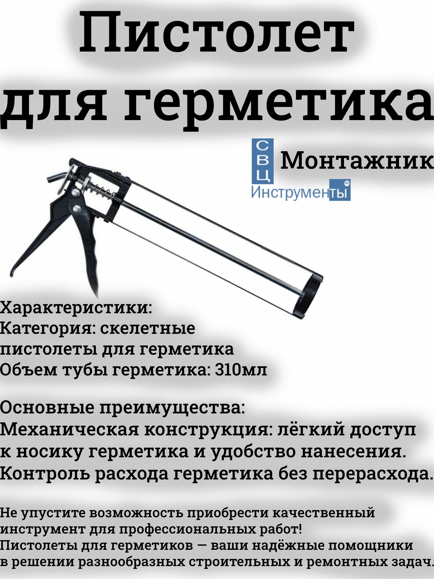 Пистолет для герметика: 310мл, скелетный, Монтажник информация: