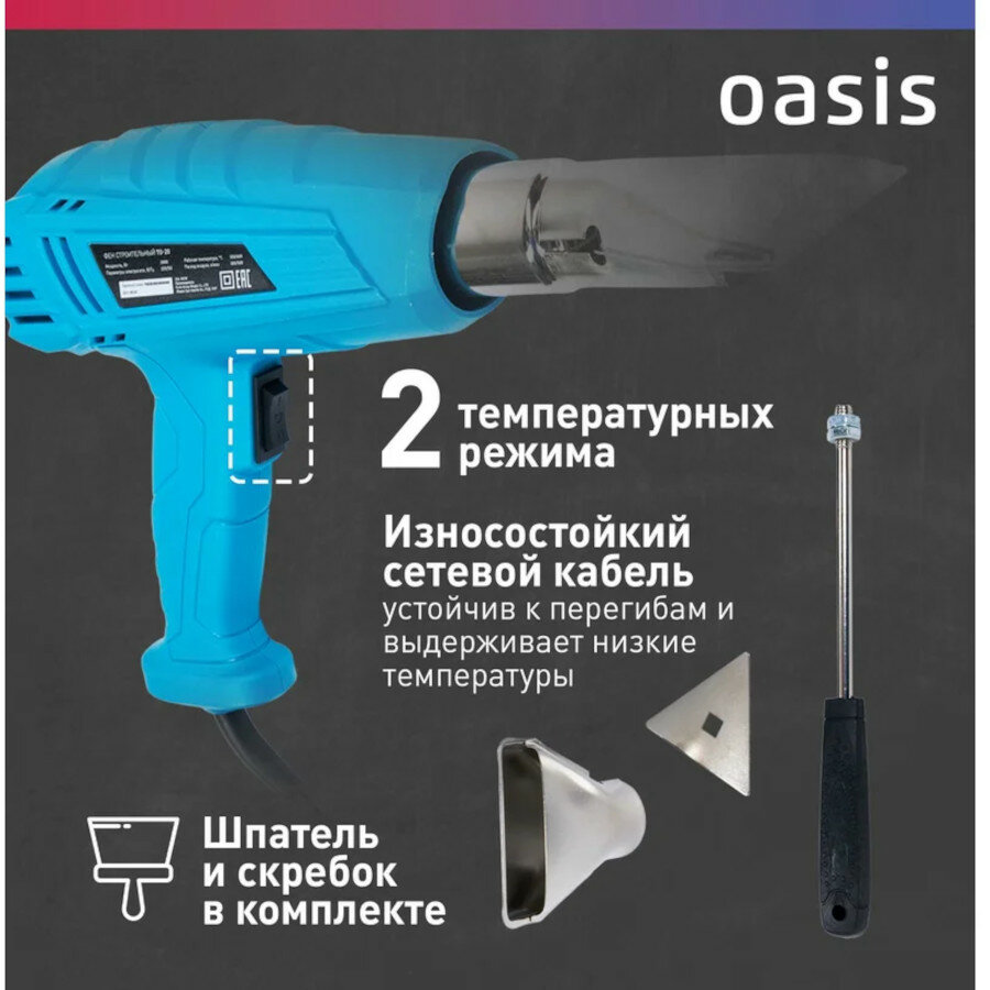 Строительный фен OASIS TG-20 2000 Вт; Рабочая температура 350/600 ℃;300/500 л/мин ; защита от перегрева информация: