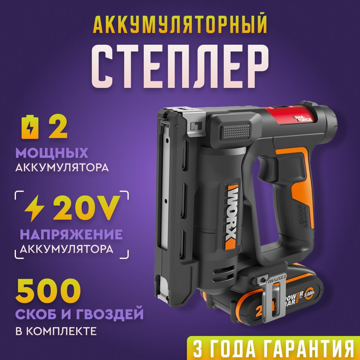 10 цен на Строительный степлер аккумуляторный WORX WX843, 20В, в комплекте АКБ, ЗУ, скобы и гвозди