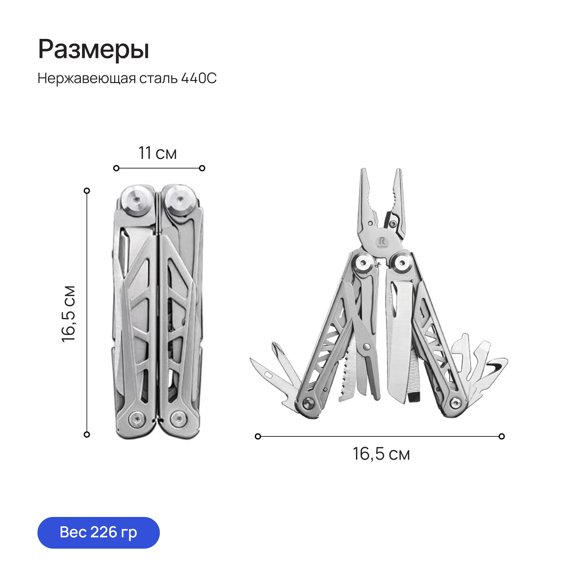 | Инструменты (функции) подробно | плоскогубцы, кусачки для твердой проволоки, обжим для электрических проводов, нож, ножницы, многоцелевой резак, открывалка для бутылок с плоской отверткой, консервный нож с плоской отверткой, отвертка Philips с фиксатором, пилка для ногтей, пила, напильник |