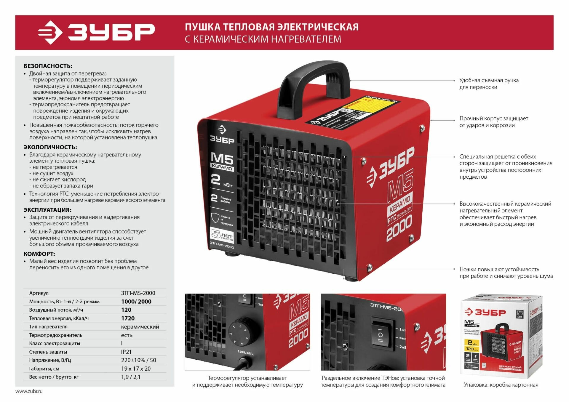 Тепловая пушка электрическая керамическая Зубр ЗТП-М5-2000 информация: