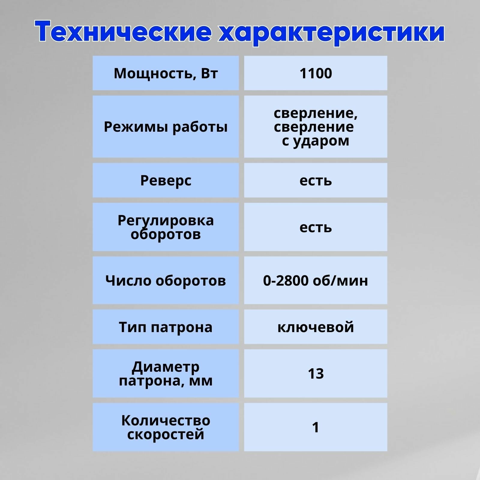 Дрель электрическая ударная Витязь ДЭУ-1100 (1100Вт, 0-2800 об/ мин, ключевой патрон 13 мм, сетевая, реверс) для сверления бетона, металла, дерева информация: