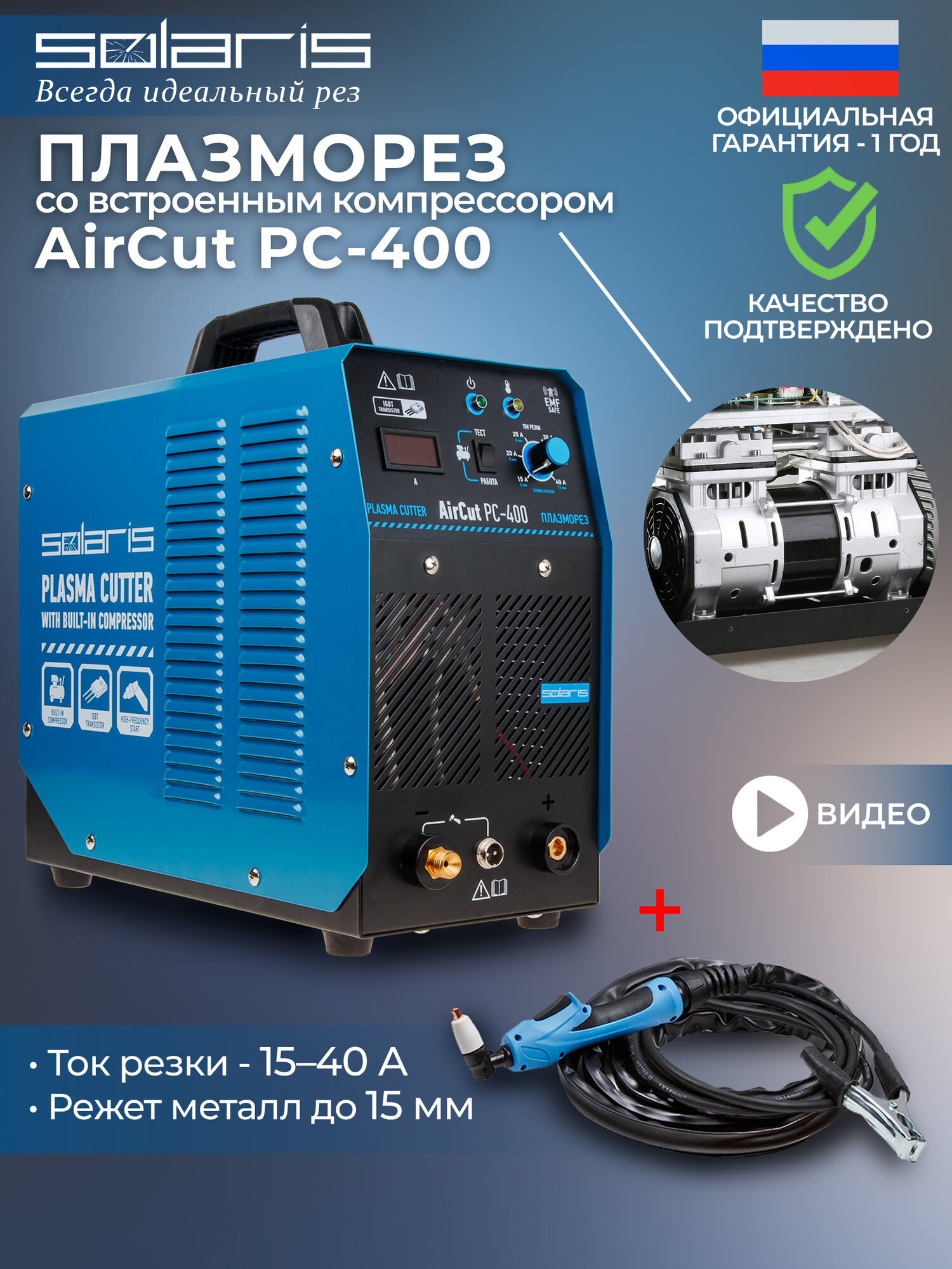 Solaris Плазморез AirCut PC-400 (220 В, 15-40 А, Высоковольтный поджиг, встроен.компрессор, термозащита, плавный запуск) () 37 859 ₽