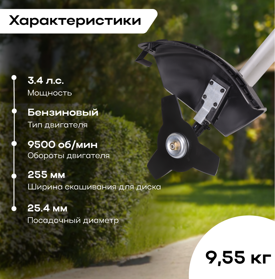 | Особенности | ширина скашивания ножом 25.5 см, леской - 46 см; тип режущего ножа 40ТР перфорированный, многозубчатый с твердосплавными напайками; тип головки с леской «Easy Load», с безразборной заправкой лески |